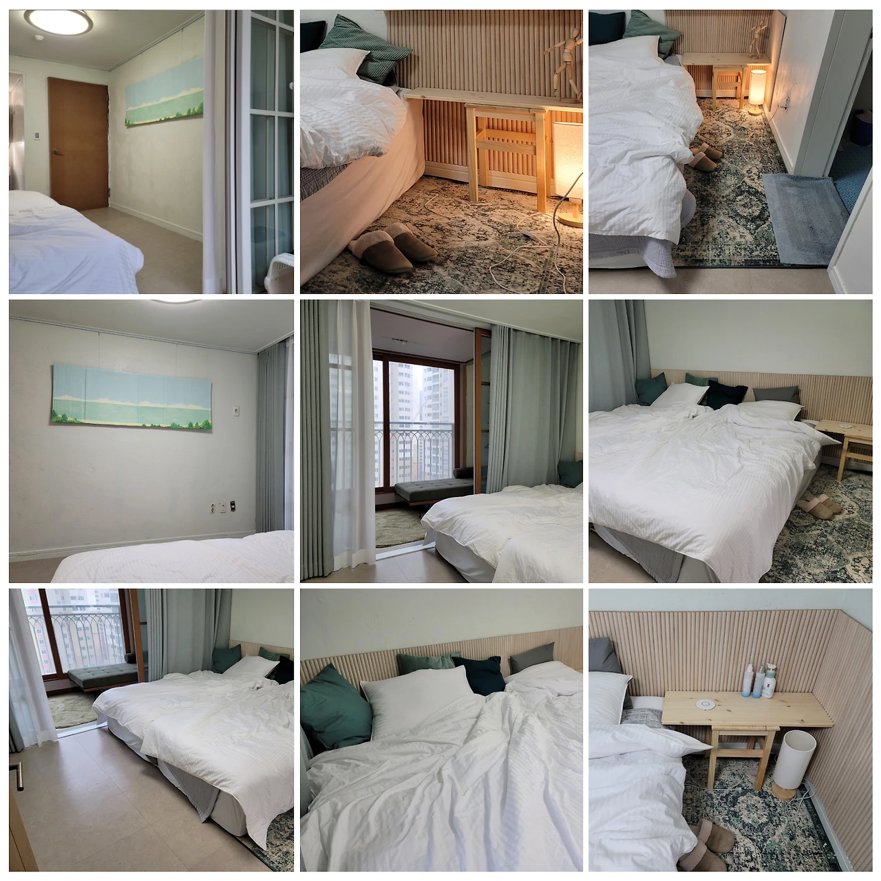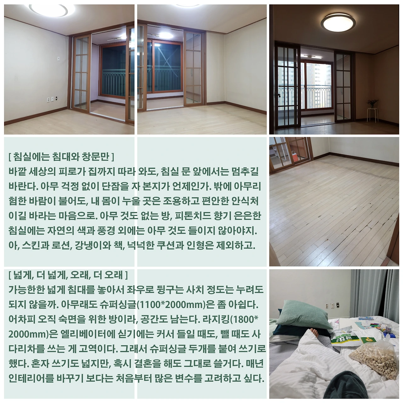 낯선 호텔룸에는 자질구레한 감정이 없기 때문에, 잡생각 없이 기분 좋은 잠이 오는 경우가 많다. 인테리어가 과하거나 물건이 많은 공간은 사람의 생각도 복잡하게 한다. 특히 침실은 안식과 숙면을 위한 공간이기에, 소품은 최소한으로 두기로 했다. 침대는 대기업처럼 홍보가 많이 되지는 않았지만 질이 좋기로 입소문이 난 노브랜드 중소기업의 체험장에서 여러 번 누워보고 결정했다. 마침 1년 정도 전시를 했던 매트리스를 개당 90만 원대로 할인하기에 하드 1개, 미디엄 1개를 구매했다. 무게감이 있어서 나란히 붙여 하나처럼 써도 쉽게 밀리지 않았다. 혼자 뒹굴기에도 드넓어 좋고, 만약 결혼을 해도 그대로 쓰면 될 것 같다. 매트리스 아래 까는 베이스는 배송 사고로 빗물이 스며 있어서 반품을 했는데, 오히려 침대 높이가 낮아져 안정감이 들고 더 방이 넓어 보였다. 침대 발치에 있는 벽이 휑하게 비어 바다 풍경을 길게 그려서 걸었는데, 창밖으로 바다 바람이 분다고 상상하면 잠이 더 잘 왔다. 그리고 베란다 공간을 활용해 장식장과 최소한의 수납을 보완했다.