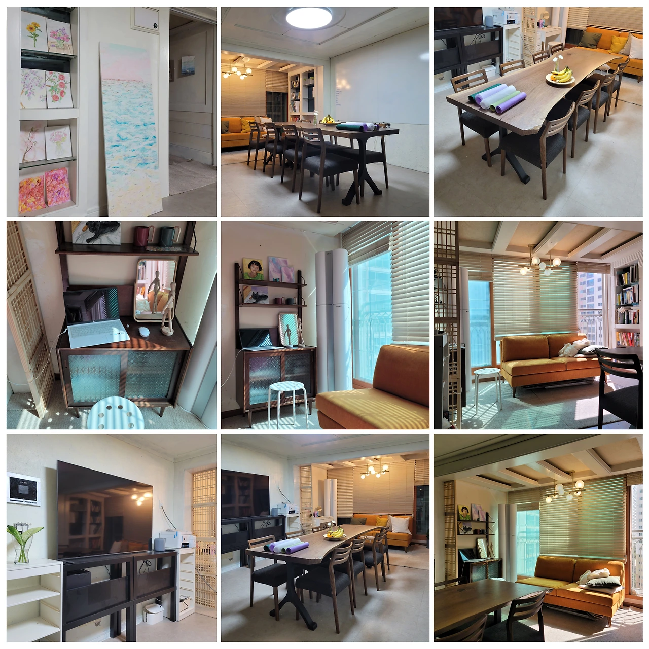 8. 각 실마다 색조합이나 컨셉을 조금씩 달리 변주하면 재밌다. 그러나 서로 조화를 이루도록 신경써야 한다. 나는 단어를 심상화하면서 각실을 꾸몄다. 현관은 맞이 갤러리, 거실은 달이 뜨는 집현전, 침실은 피톤치드 숲, 게스트룸은 알라딘 양탄자, 드레스룸은 바비 옷입히기, 주방은 소탈한 웜톤.