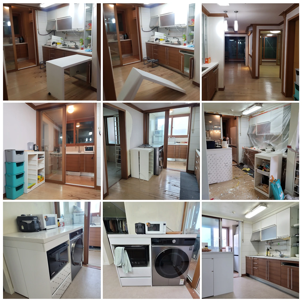 셀프 시공이나 기성 제품 배치로 해결할 수 없는 부분이 있다. 그럴 때면 대기업 브랜드를 무조건 고집하기보다는, 집에서 가까운 가게를 찾아가 상담을 받고, 현장 미팅을 하고 합리적인 가격으로 거래를 했다. 그런 대부분의 결과물은 만족스러웠지만, 억울한 분쟁에 눈물을 쏟은 경우도 있었다. 세탁 건조기와 오븐의 규격대로 스케치까지 해드리며 의뢰한 주방 아일랜드의 높이가 8cm나 모자라게 재단된 것이다. 당황해서 말 수가 줄어든 사장님을 보고 나는 진작에 눈치를 챘지만, 다시 제작해 달라는 말을 꺼내기는 민망했다. 그래서 마무리 잘 지어 달라고 웃으며 자리를 비웠는데, 집에 돌아와 보니 삐뚤빼뚤한 8cm 높이 합판을 덧대어 어설프게 마감을 해놓은 걸 보고는 경악을 했다. 그리고 얼마 후 오븐 코드를 뽑으려 뒤를 살폈는데, 코드가 건조기 방향으로 완전히 갇혀서 손댈 수 없는 걸 발견했다. 뒤늦게 전기 배선에 대한 하자 신청을 했지만, 대리점에서는 나를 진상 손님처럼 대하며 딱 잘라 거절했다. 본사에서는 대리점에서 정품이 아닌 짝퉁을 시공하고 서류를 남기지 않아 보상을 받을 증거가 없다고 했다. 말도 안 되는 불공정 거래였지만 더는 이 일로 속을 끓이기 싫어서 분쟁을 중단하기로 했다. 시공 하자는 현장에서 엄격하게 즉시 바로 잡아야 한다는 걸 다시 한번 느꼈다.