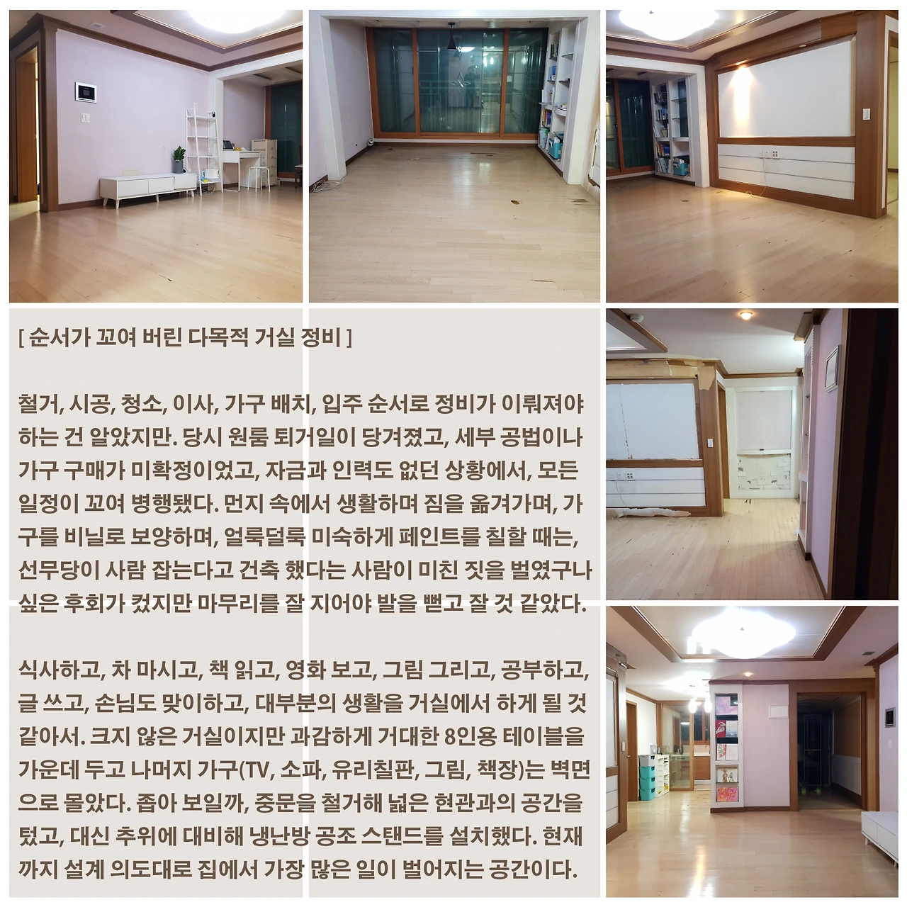 2. 기존에 쓰던 가구를 임시로 배치해서 생활하면서, 새로운 가구에 대한 계획을 짰다. 치수, 색깔, 재질, 동선 등을 고심할 시간을 벌 수 있었다.