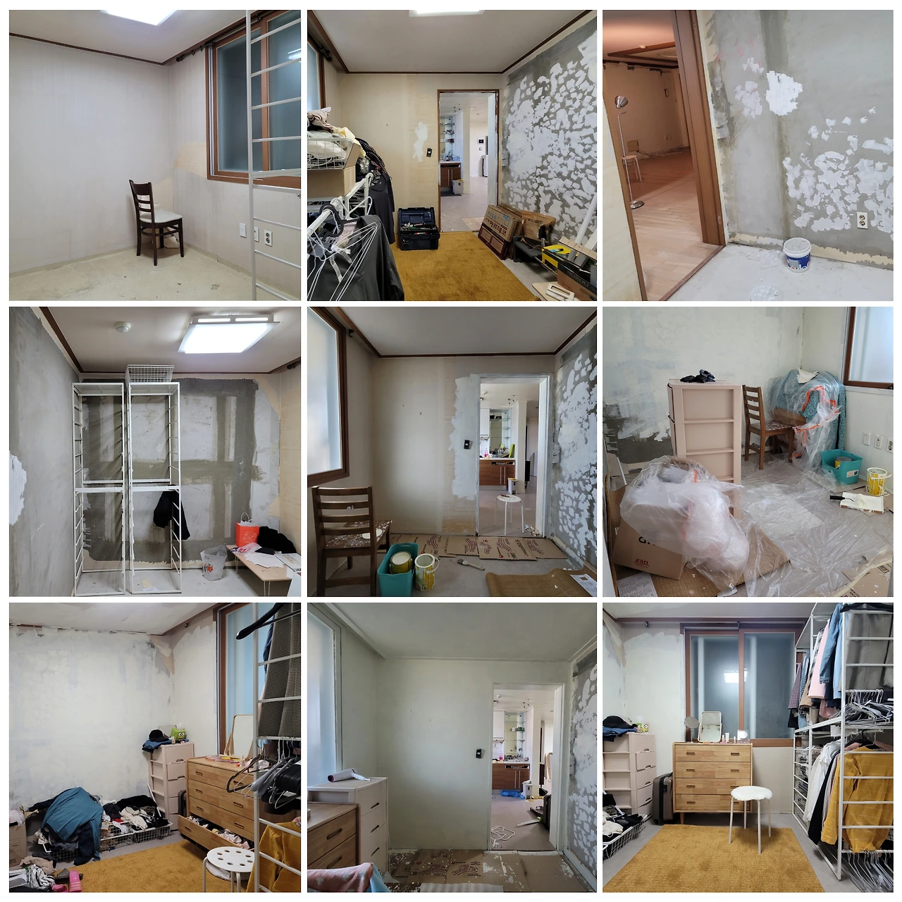 건축 행위는 주어진 돈과 시간 안에서 최대 효율을 내야 하는데, 입주 공사는 여러모로 열악했다. 매수 잔금을 겨우 치른 상태라 내게는 현금이 전혀 없었고, 재료비 정도만 신용카드로 살 수 있었다. 그리고 팔을 걷어붙이고 공사를 도울 남자 지인이 없었다. 당시 보증금을 받으려고 원룸 퇴거를 서둘렀기에, 선입주 후공사 형태로 실거주와 리모델링을 병행했다. 이미 순서가 꼬여버린 공사라 매일 정신이 없었다. 한 방에서 배달음식을 시켜먹고 잠을 잤고, 다른 방은 풀지 않은 이삿짐이 가득했고, 또 다른 방은 벽지를 뜯어 먼지가 자욱한 가운데 페인트칠을 하고 있었다. 선무당이 사람을 잡은 걸까. 건축학과에서 5년 동안 디자인 공부를 하고 공기업에서 4년 넘게 건축 공사 감독을 해왔지만, 셀프 공사는 상상을 초월하는 골치였다. 그러나 어쨌든 한 번 시작을 했으니 우스워도 끝을 맺기로 했다.