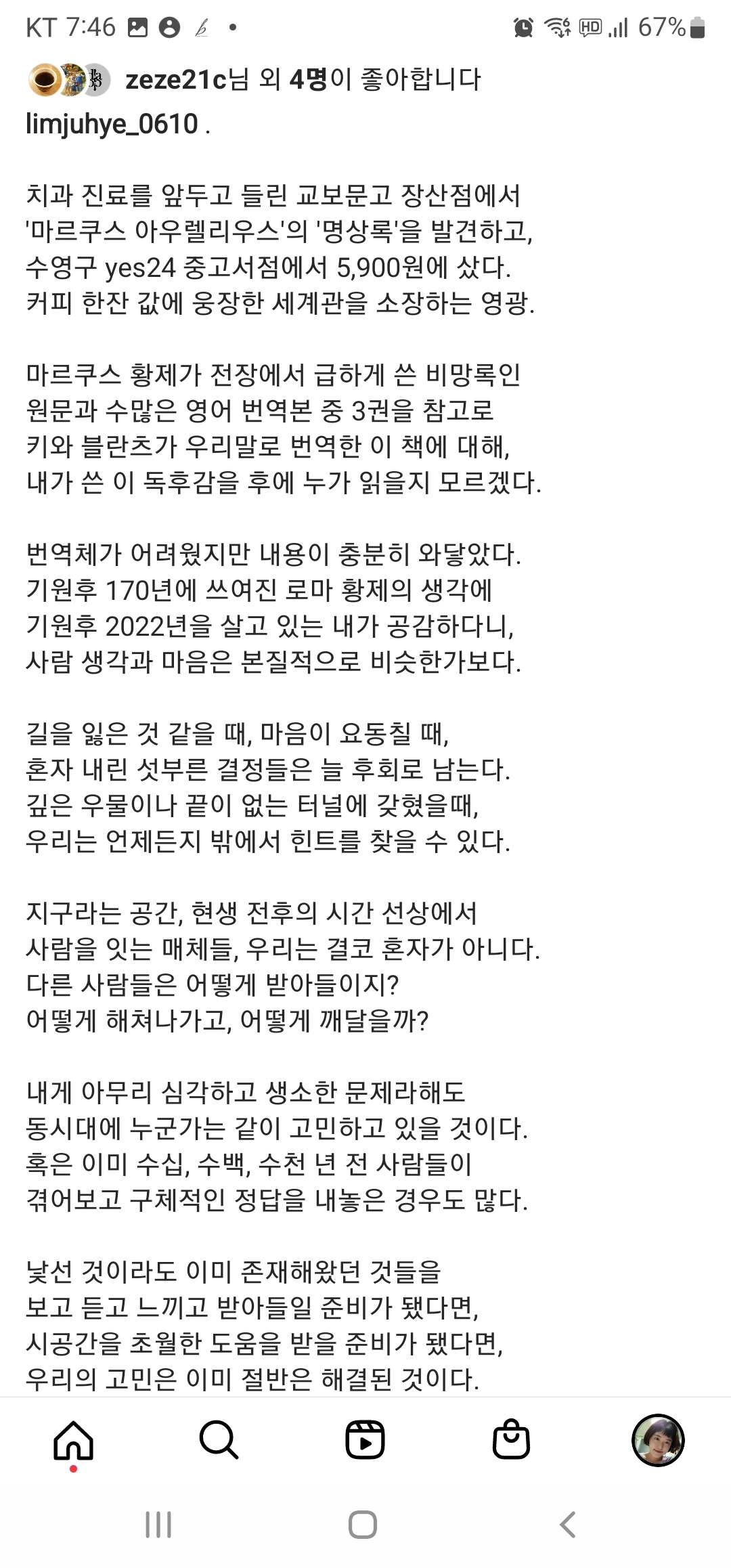 존경스러운 지식인의 논리를 내 글에 인용한다는 것은 조심스러운 일이다. 내가 엉터리로 그들의 논리를 공부하고 내 생각인양, 내 글에 어설프게 녹여낼까 봐, 또는 왜곡해서 전달할까 봐. 나는 차라리 전체 문장을 고스란히 옮겨 쓴 뒤 출처를 밝힌다. 아무리 좋은 글을 쓰고 싶데도 훌륭한 마인드를 표절하거나 왜곡할 수는 없다. 정말 소중한 생각은 시대와 종교를 초월해서 반복되며, 시대에 맞게 세련되고 아름답게 다듬어진다. 나는 많은 사람들이 이런 화두를 접하고 같이 고민해봤으면 좋겠다. 내 경우에는 이지영 강사의 유튜브에서 마이클 샌델에 대한 이야기를 접하고 그의 책들을 사게 됐다. 한편 내 글을 읽고 마이클 샌델에 대해 알게 되는 분도 계실지 모르겠다. 내가 대단한 지식인이나 작가는 아닌, 그저 수많은 전달자 중에 한 명이 될지라도 그것은 충분히 의미 있는 일이다.