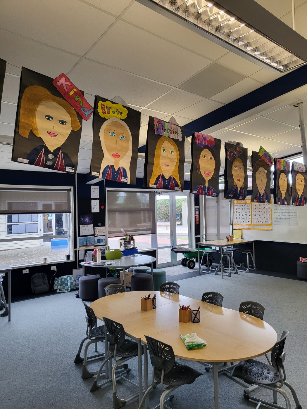 아이는 학교생활을 무척 즐거워했다. 정해진 교과서가 없이 선생님의 재량으로 수업이 이루어지는데, 한 가지 주제를 가지고 여러 과목에 걸쳐서 통합적으로 배웠다. 마침 새 학년의 시작이라 ‘나’를 주제로 수업이 진행되었다. 영어 시간에는 나를 소개하는 글을 썼고, 산을 좋아하는지 바다를 좋아하는지 그 이유는 무엇인지 등을 쓰고 발표했다. 미술 시간에는 앞으로 1년 동안 교실에서 사용할 사물함이나 개인 물품 등에 붙일 자신의 이름과 마크를 그려서 장식했다. 내가 생각하는 나의 얼굴을 그려 교실에 쭉 붙여놓았는데, 기민이가 그린 그림을 발견하고 무척 반가웠다. 아이 이름이 적힌 그림을 보니 정말로 이 학교를 다니고 있구나 하는 실감이 났다. 한국에서는 똑같은 글쓰기를 하고 그림을 그려도 그것이 잘 해내야 하는 ‘과제’로 느껴졌는데, 이렇게 물 흐르듯이 스며드는 교육을 하니 재미있는 ‘놀이’처럼 보였다.