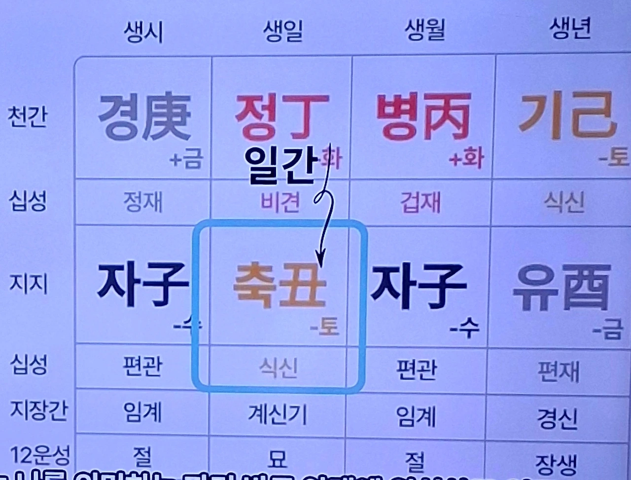 예) 일간인 정이 나다. 아래에 축이 내 배우자다. 내가 배우자를 생해주는 식신이 내가 원하고 바라는 배우자감이다.