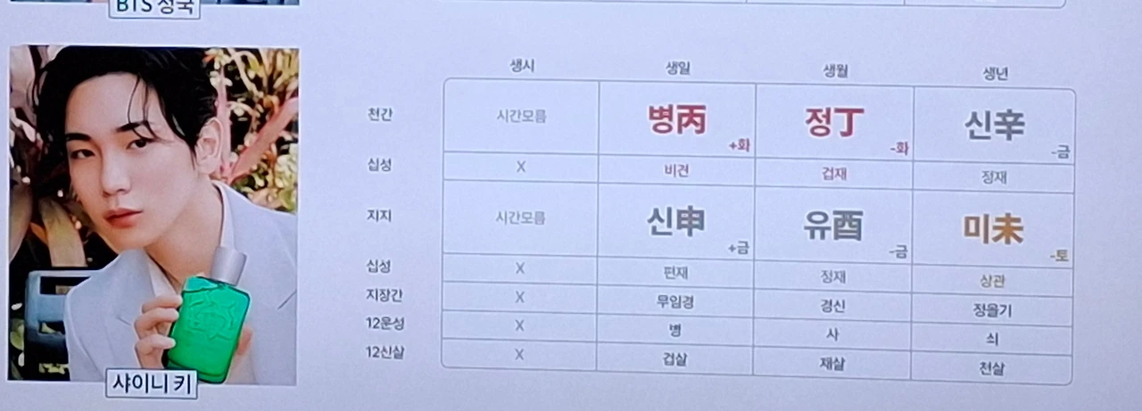 샤이니 키는 정국처럼 병화의 기운이나 지지에 신금이 와서 햇빛이 보석을 비춰주는 모습으로 가수로서 성공했어요. 병은 스스로 인생 뭐 있냐, 만사가 재미없구나 하는 생각을 하며 어릴 때부터 애늙은이 소리를 듣기도 한답니다.