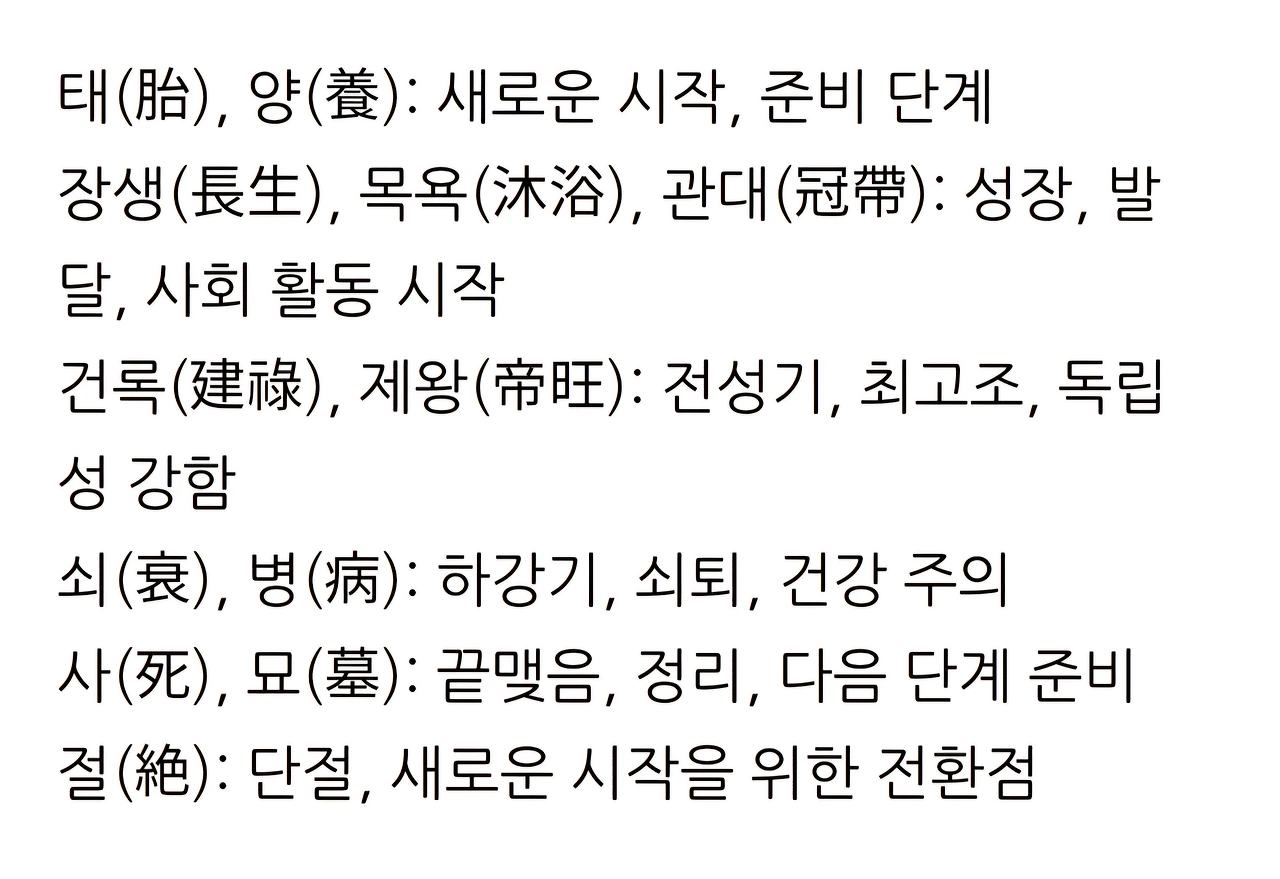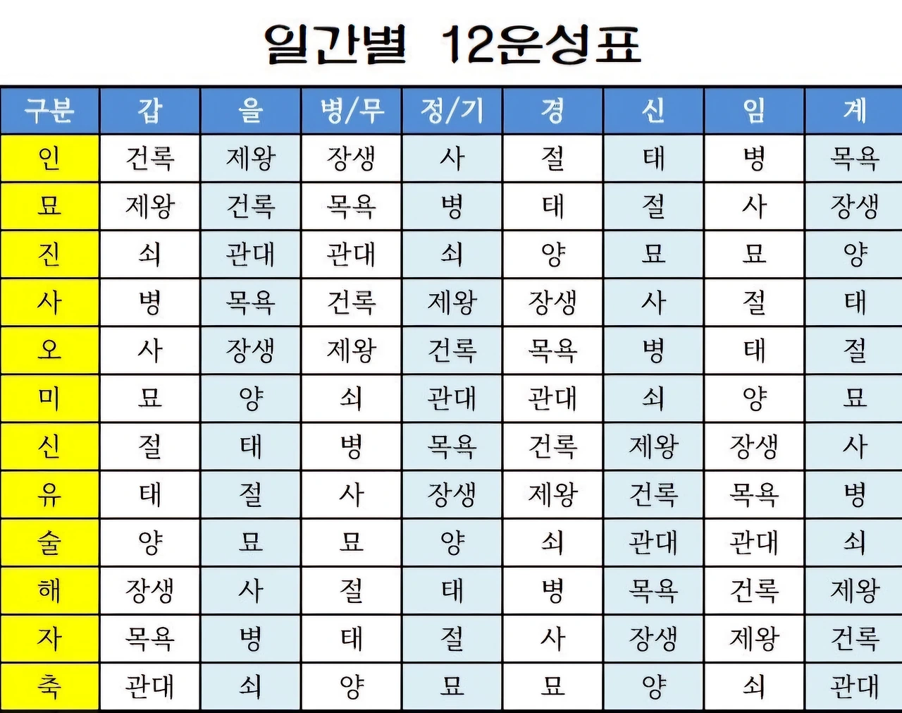 12 운성이란 생로병사를 운과 자연의 흐름에 맞춰 12단계로 나누어 놓은 걸 말합니다.