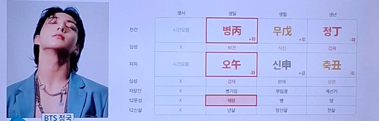 BTS 정국은 일주가 병화입니다. 천간 병화도 불, 오화의 지지도 불이라 불의 기운이 강해져 제왕의 기운을 품고 있어요.