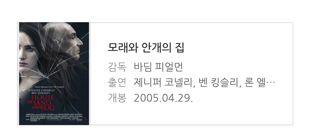 <모래와 안개의 집>영화는 집을 지키려는 자와 차지하려는 자, 각자의 입장에서 집의 의미가 무엇인가를 우리에게 말한다.