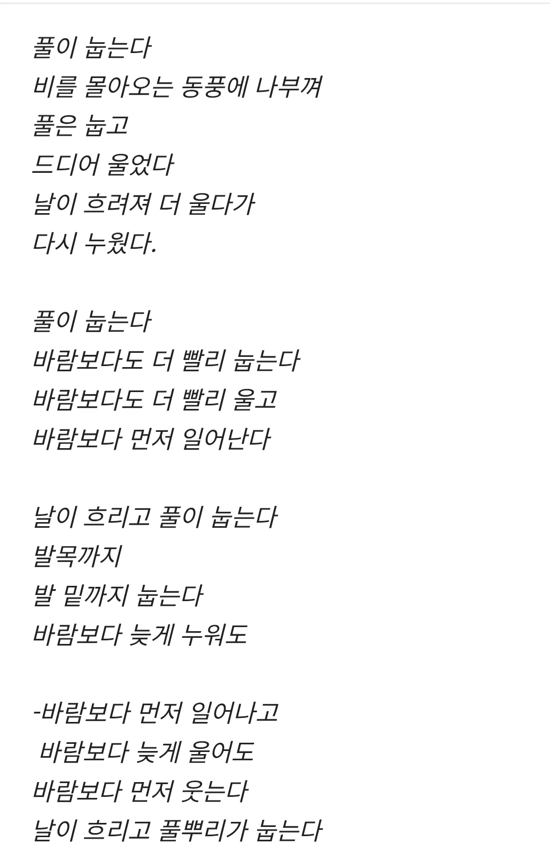 20대 학창 시절 좋아하던 김수영 작가의 "풀"입니다. 을목의 모습을 잘 표현한 시라고 생각됩니다.