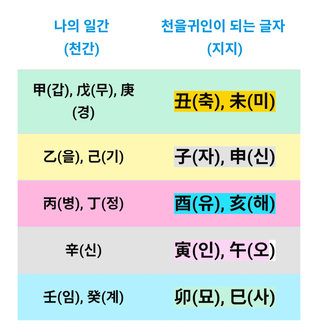 자신의 일간(태어난 날의 천간)을 기준으로 지지에 아래의 글자가 있다면 천을귀인이 있는 것입니다.