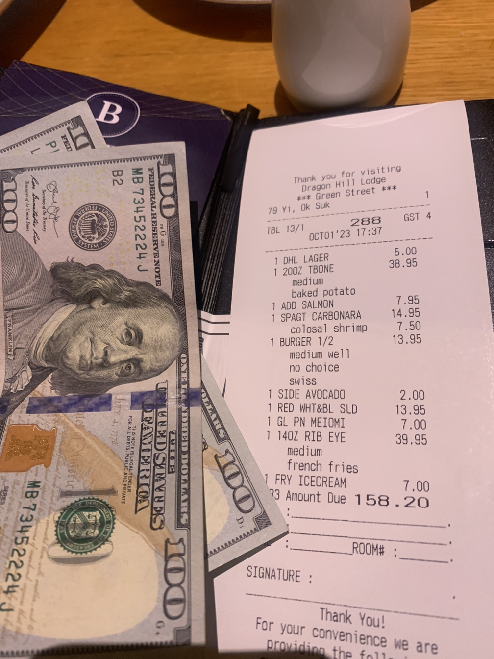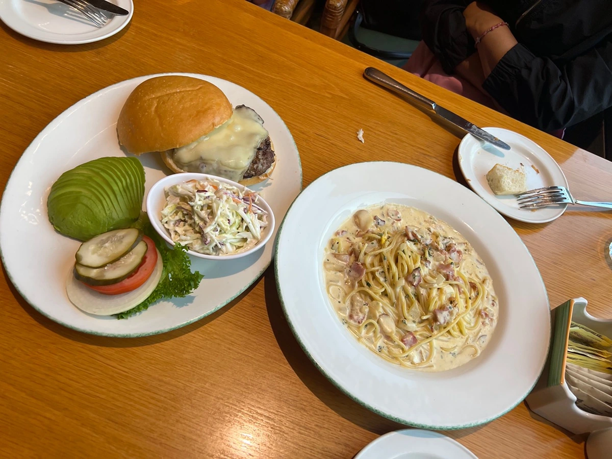 드래곤힐 호텔은 아무나 들어갈 수 없다는 단점이 있다. 용산에 있는 미군 기지인데, 지인의 에스코트가 필요하다. 우리는 저녁 외식을 위해 드래곤힐 롯지 호텔 레스토랑인 그린스트리트에 갔다. 메뉴는 이미 사전에 정해졌다. 카르보나라 스파게티, 스테이크, 레드. 화이트&블루 샐러드, 햄버거. 일단, 매장에 입장한다. 주문을 했다. 먼저, 티본스테이크, 카르보나라, 햄버거를 먼저 시켰다. 음료는 용산 맥주를 먼저 시킨다.