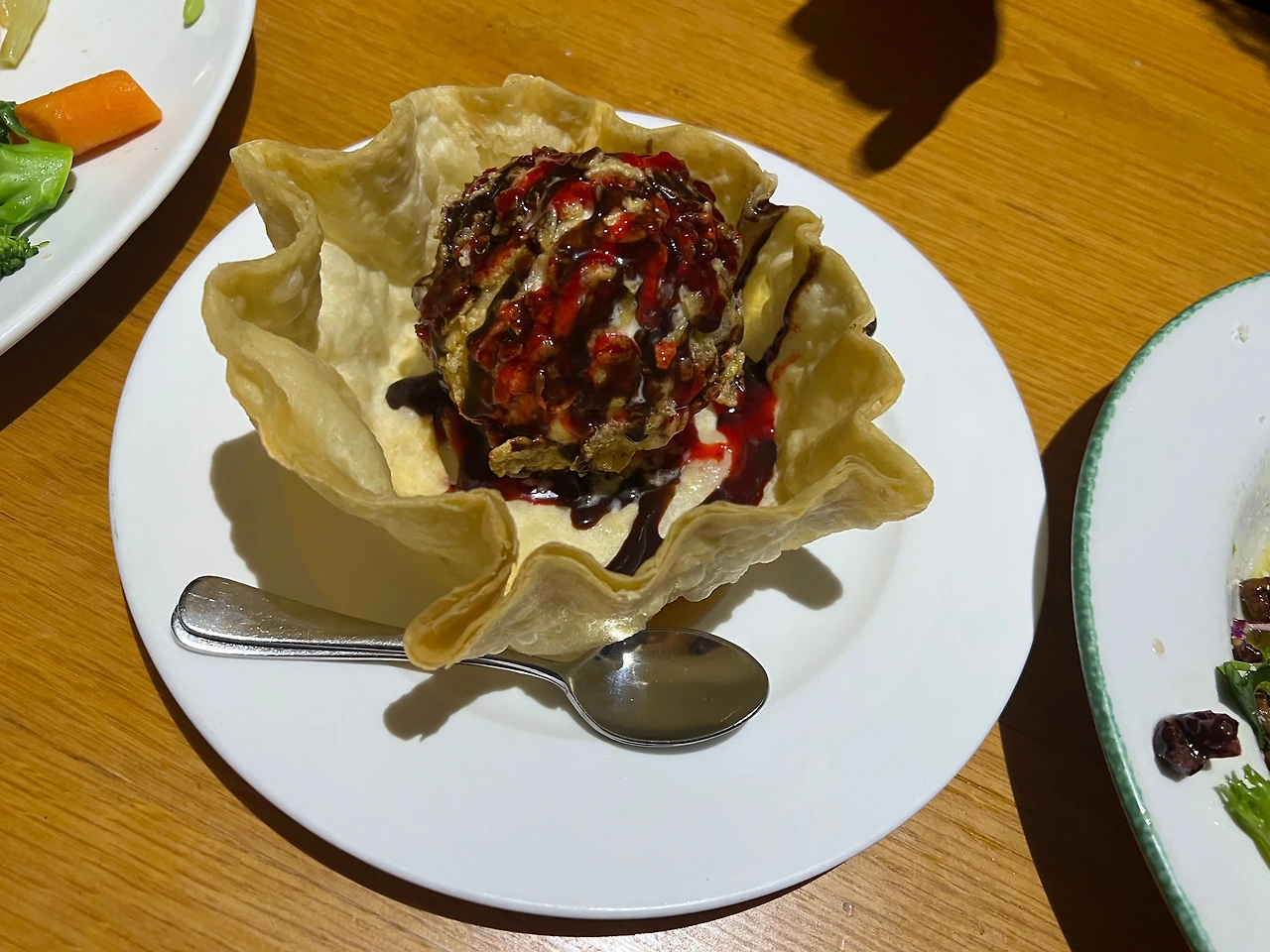 후식으로 아이스크림 튀김을 먹는다. 정식 명칭은 프라이드 아이스크림이란다. '아이스크림을 왜 튀기나, 이상한 미국 문화다'라고 생각했다. 그러나 아이스크림 한 입 먹자마자, '역시 튀김은 뭘 튀겨도 맛있구나'라는 생각을 한다. 아이스크림 위에 뿌려진 시리얼이 바삭하니 부드러운 아이스크림 식감과 어울린다. 부드러움과 바삭함의 아이러니한 조합. 단짠과 같은 조합이랄까? 부들+바삭, 훌륭하다. 바닐라 아이스크림도 물이 많이 들어간 저렴한 아이스크림이 아닌 유지방이 많이 함유된 묵직한 바닐라 아이스크림이었다. 디저트로 강추하는 메뉴다. 가지면 꼭 먹어 보시길.