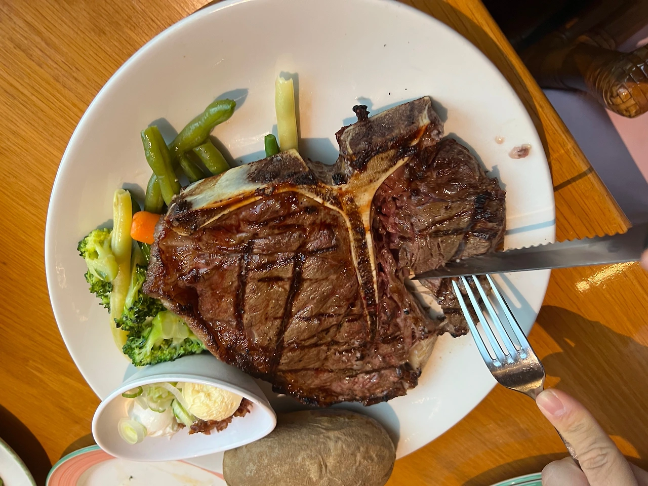 추가로 립아이 스테이크를 시켰는데, 사진이 없다. 이런... 립아이는 우리 말로 꽃등심 스테이크다. 티본도 맛있었지만 립아이는 너무 부드럽고 기름져서 배불렀는데도 맛있게 먹었다. 무조건 스테이크는 꽃등심이다. 맛있다. 다음에는 립아이 스테이크에 립을 추가로 시켜서 먹어야겠다. 아무래도 티본 무게가 마음에 안 든다.