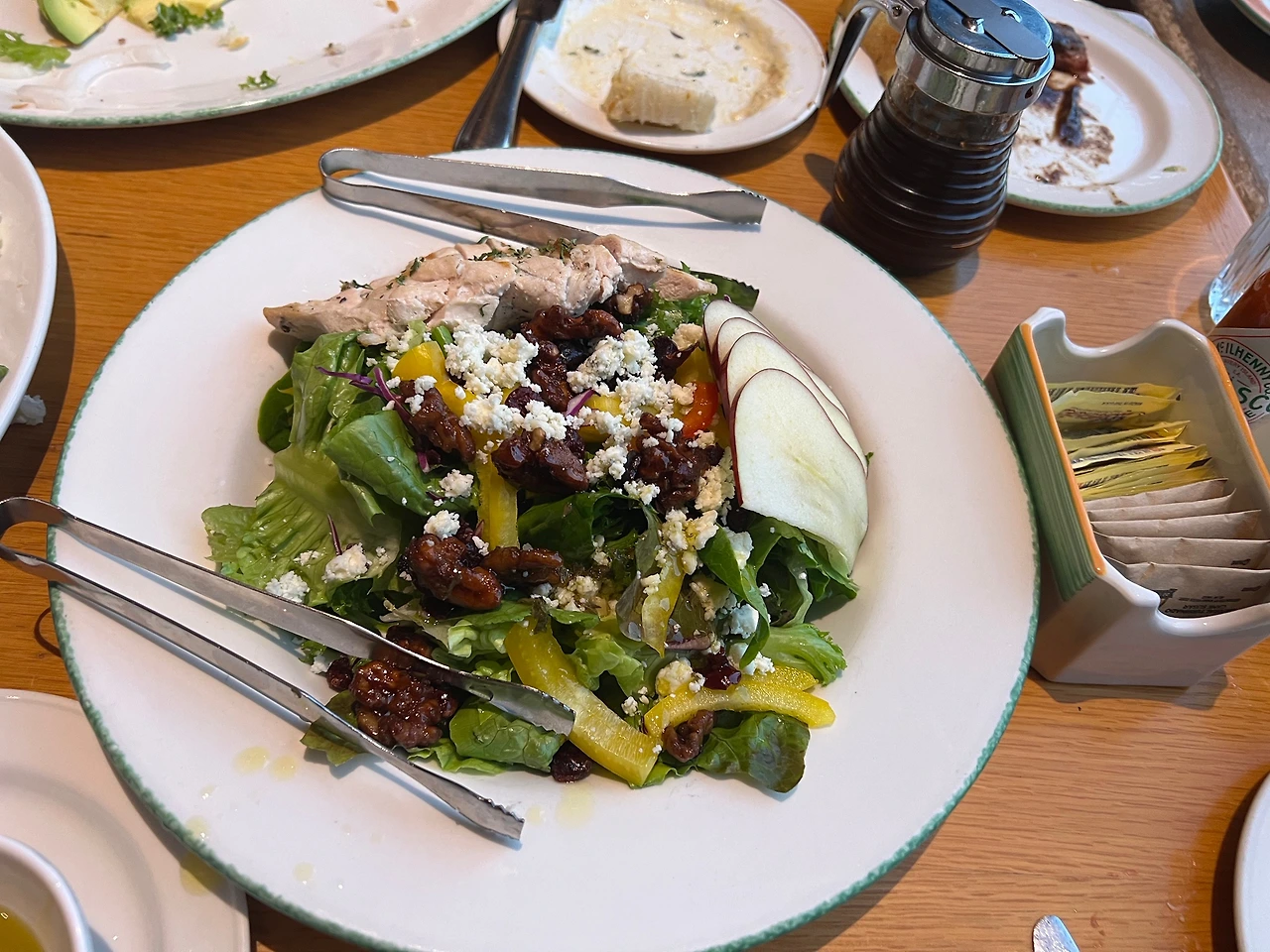 고기만으로는 모자란 영양분을 채소를 통해 채워야 한다. 샐러드 추가 주문한다. 레드, 화이트&블루 샐러드다. 레드는 사과를 의미하는 것 같고 화이트는 닭 가슴살, 블루는 고르곤졸라 치즈를 의미하는 듯하다. 작명가가 센스가 있다. 요즘 사과가 들어간 음식을 많이 접하게 되는 것 같다. 드레싱은 올리브오일 베이스에 레몬 비니거& 기타 등등인 것 같다. 드레싱 이름은 말씀해 주셨었나? 기억 안 난다. 일단, 음식 한 쪽에만 살짝 뿌려서 맛본다. 맛이 꽤 괜찮아서 전체적으로 부어 먹었다. 맛있었다. 샐러드에 들어간 호두 절임이 아주 맛있었다. 라즈베리도 상큼하니 입맛을 돋웠다.