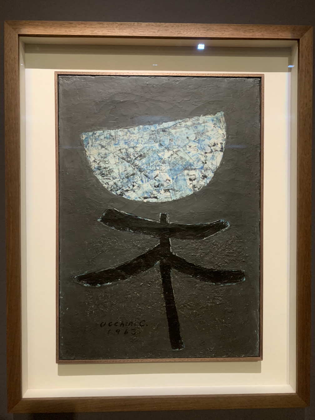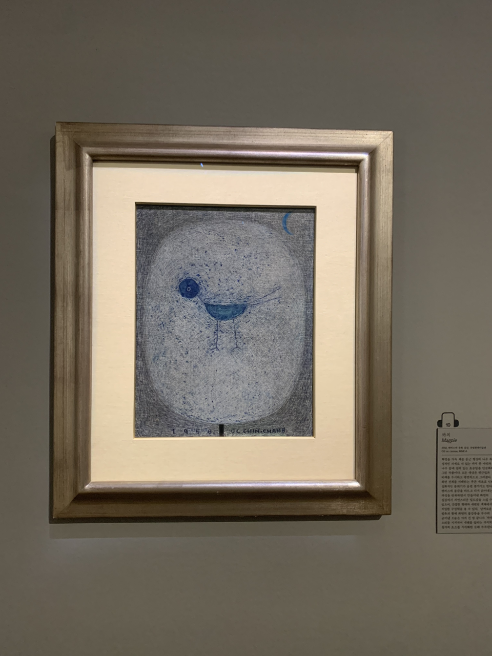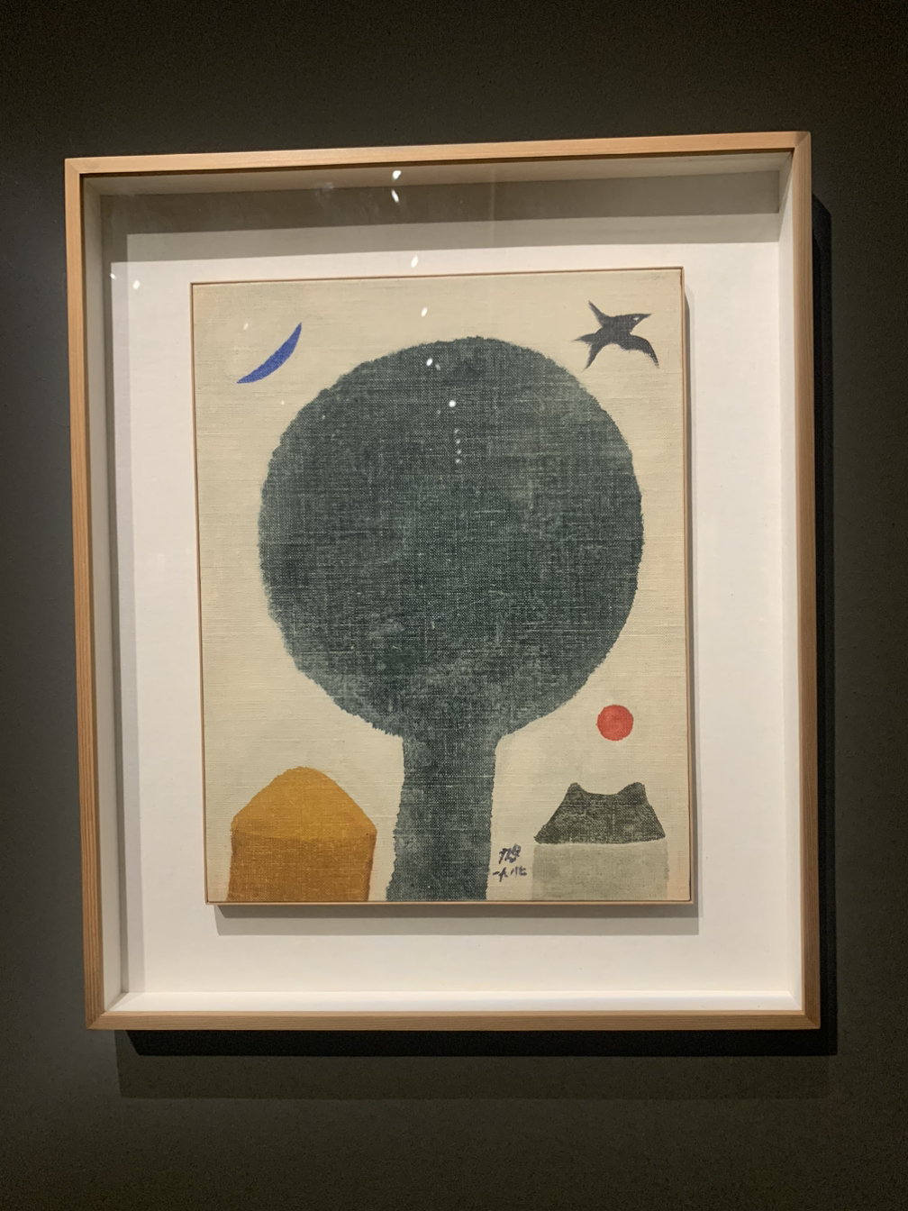 1전시실에서 '반월, 목'이라는 작품을 감상했다. 반달과 한자 나무 목(木)자를 그림으로 형상화한 작품이다. 반달은 붓으로 흰색, 푸른색 물감을 슥슥 바른 다음 나이프로 진회색의 물감을 찍어낸 듯한 질감을 나타낸다. 나무와 반월을 제외한 배경은 진회색 물감의 두터운 마티에르가 느껴진다.