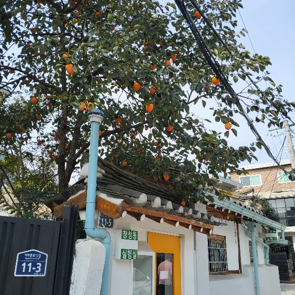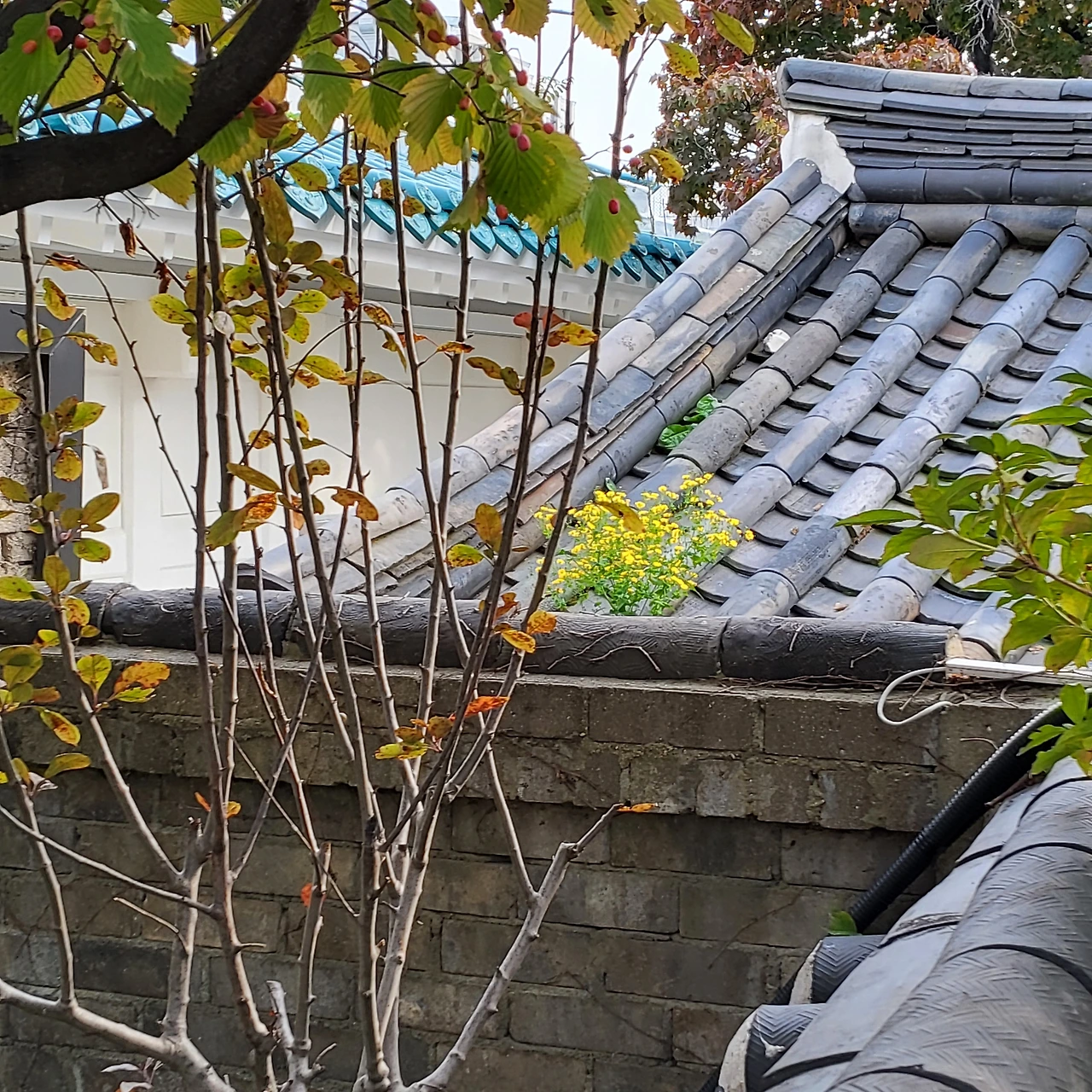 기와 사이를 비집고 자라 담장 밖으로 고개를 내민 우아한 산국, 비좁은 플라스틱 화분에서 홀로 씩씩하게 자라고 있는 잡풀들, 담을 타 넘어 당장이라도 씨알 굵은 열매하나 내어줄 것만 같은 감나무.