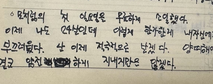 그래서였는지 한 쪽 구석에는 가정에 대한 열망을 비췄다. 따듯한 가정이 인격 형성에 얼마나 큰 영향을 끼치는지 알고 있더랬다. 본인의 가정은 화원처럼 꾸미겠다는 알찬 포부도 적혀있다.