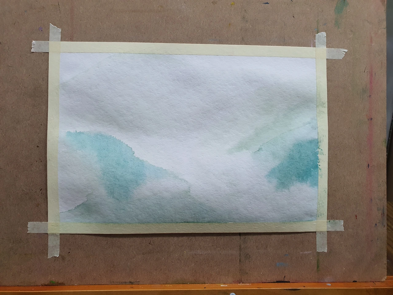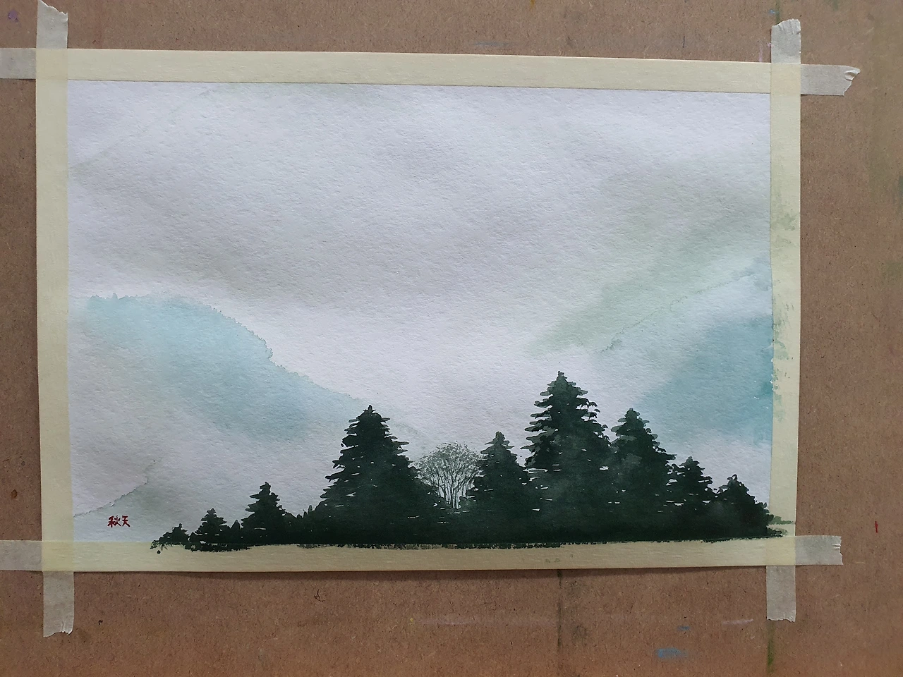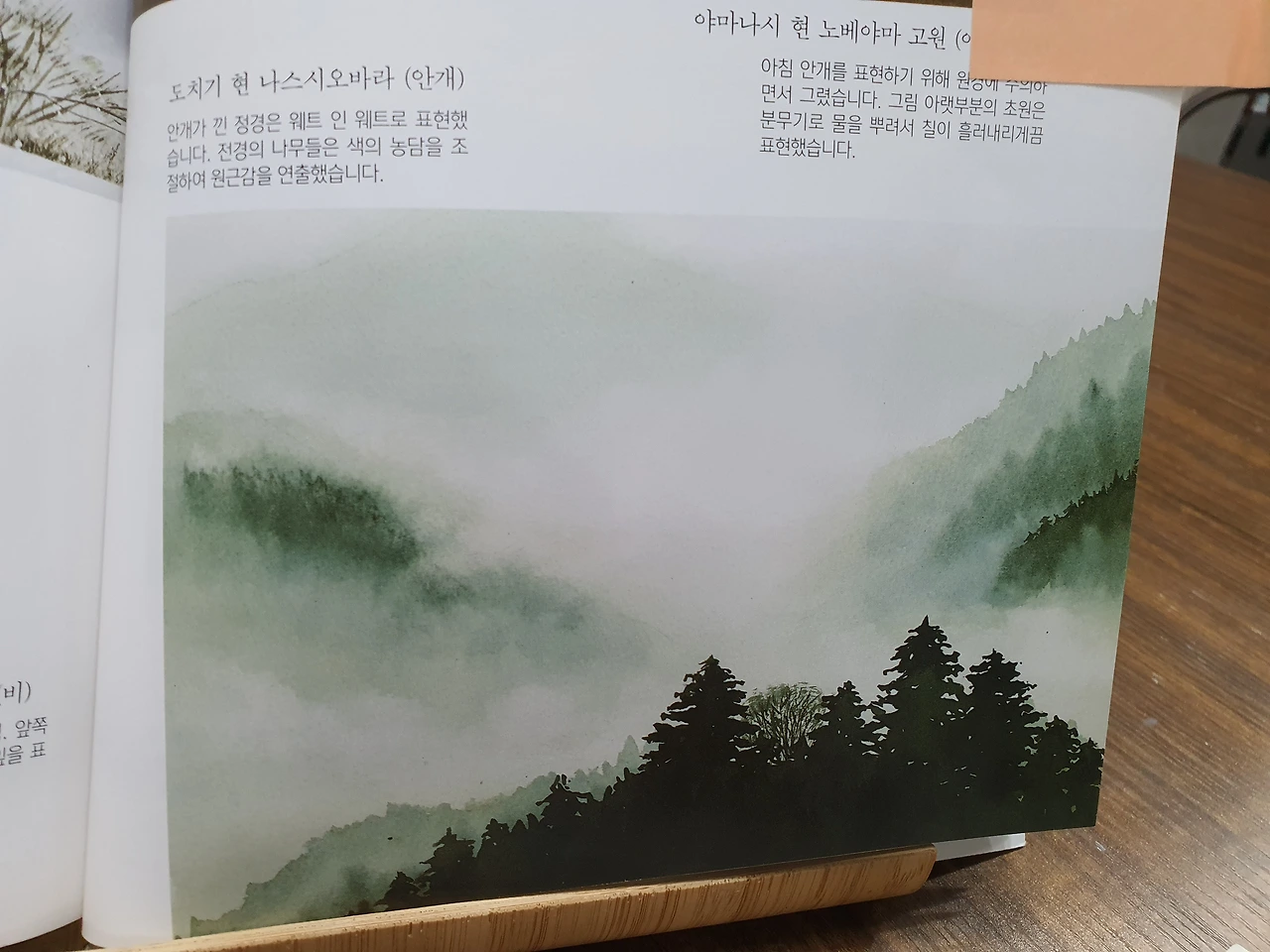 오늘 그릴 그림은 '도치기 현 나스시오바라(안개)'로 골랐다. '안개가 낀 정경은 웨트 인 웨트로 표현했습니다. 전경의 나무들은 색의 농담을 조절하여 원근감을 연출했습니다.'라는 설명이 있다. '웨트 인 웨트'? 인터넷을 검색해 보니 '이미 젖어있는 종이에 색을 칠해 자연스럽게 번지도록 하는 기법으로, 앞서 칠한 물감이 마르기 전에 깨끗한 물로 종이를 적신 후 새로운 색을 칠하는 것'이란다. '이렇게 하면 물감이 물기를 따라 번지면서 자연스럽고 신비로운 효과를 만들어내는데, 종이의 넓은 면을 적실 때는 커다란 평 붓이나 부드러운 스펀지를 사용하는 것이 편리'하고, 기법을 사용할 때 주의해야 할 점들에 대해서도 친절하게 설명되어 있었다. 요즘은 웬만하면 인터넷 검색으로 궁금한 걸 다 해결할 수 있어서 참 편리해졌다는 생각도 들지만, 한편으로는 정확히 이 감정이 뭔지 설명하기 힘들지만 조금씩 잊혀지고 있다는 상실감(喪失感) 비슷한 느낌도 받는다. 아마도 요즘 내가 직장에서 아웃사이드(outside)로 밀려나는 듯한 분위기라 그렇게 느끼는 걸 수도 있겠다.