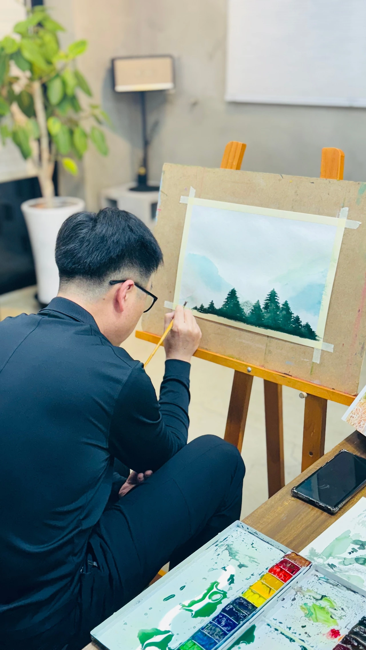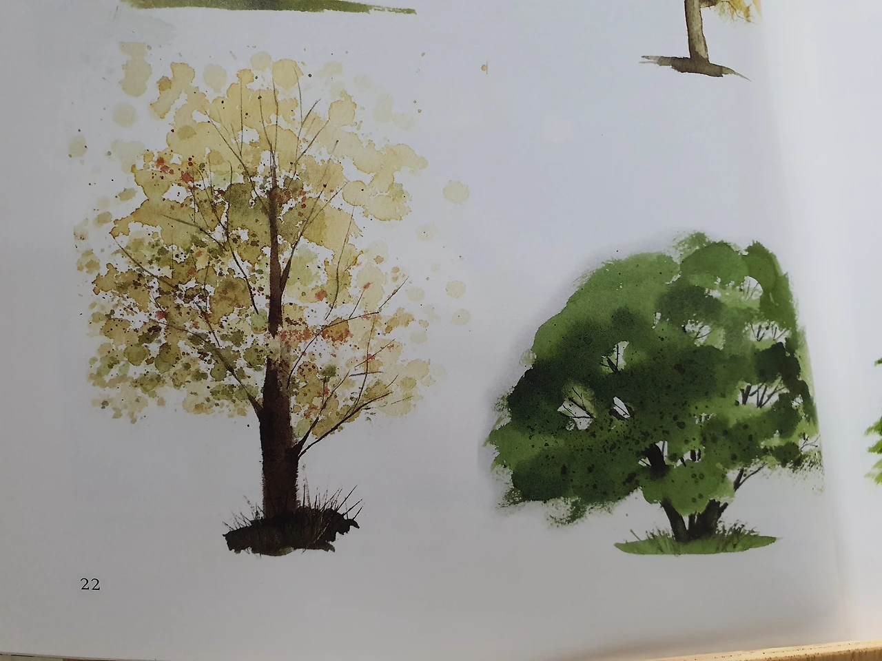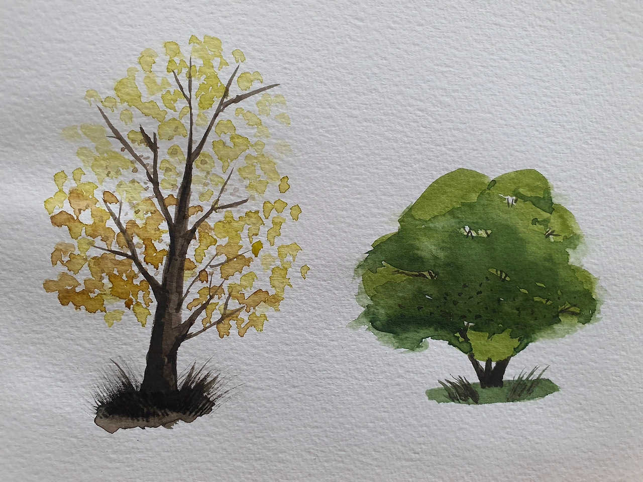 본격적인 그림을 그리기 전에 먼저 나무 그리기 연습부터 시작했다. 오늘은 사진 속 두 그루를 그려봤다. 역시나 내 잘못된 습관들을 지적받았다. 나무줄기는 굵은 아랫부분을 먼저 연하게 그리고 나서 잎을 그리고, 잎이 어느 정도 마르면 중간 줄기 부분과 가는 잔가지를 물감의 농도를 조절하며 그린다. 줄기는 잎으로 가려지는 부분이 있어야 나무의 입체감이 생기고, 잎도 균일한 크기가 아니라 불규칙하게 조화를 이뤄야 자연스럽다. 잎과 잎은 군데군데 겹쳐주고, 색상도 다양하게 써줘야 빛에 따라 변하는 잎을 생동감 있게 표현할 수 있다. 다 그리고 나서 붓끝에 물감을 묻힌 후 다른 붓으로 머리 부분을 쳐서 작은 점들을 나무 위에 흩뿌린다.