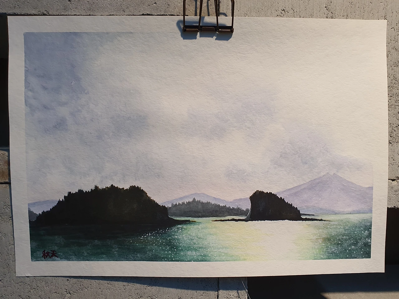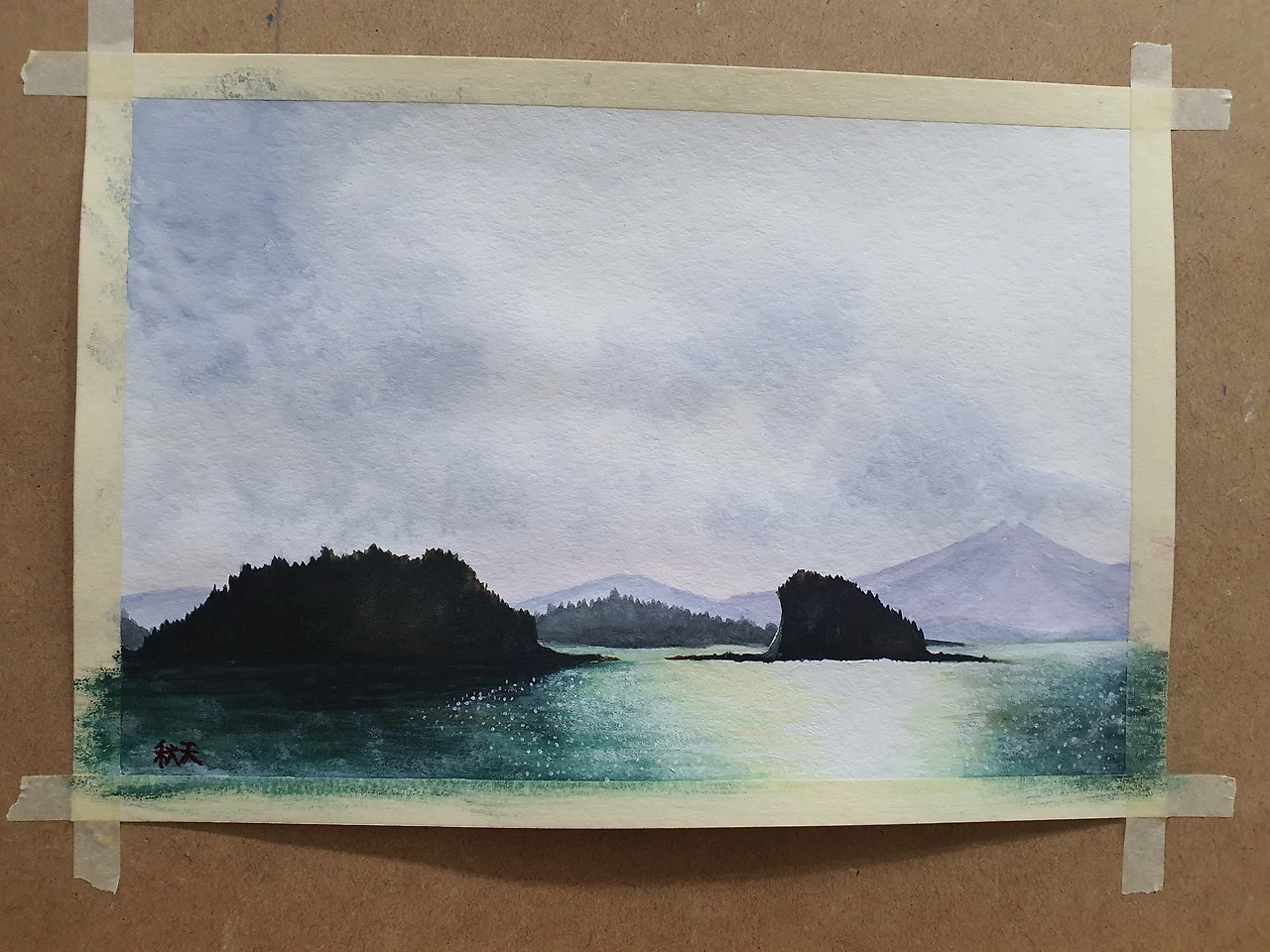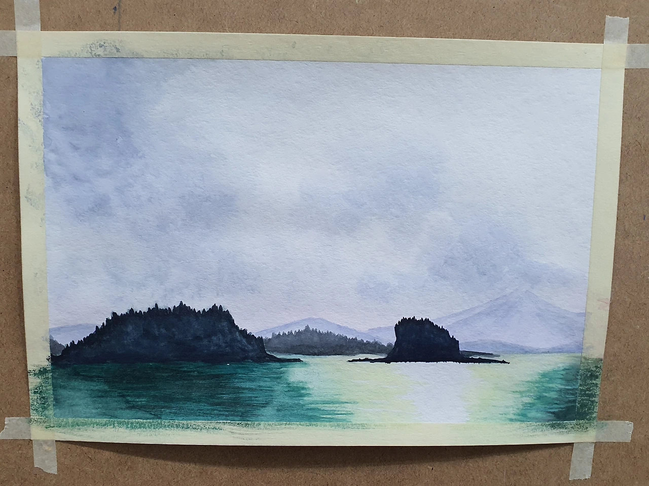 일단, 바다의 색이 너무 어둡고 탁한 느낌이 났다. 물티슈를 이용해서 부분 부분 닦아내니 조금은 바다처럼 보이기 시작했다. 다음으로 섬들이 전체적으로 차가운 느낌이다. 아침 햇살을 받아 바닷물이 반짝거리는 상황에서 섬들도 조금 따뜻한 느낌을 주면 좋겠다는 의견에 따라 기존 색을 조금 걷어내고 그 위에 갈색을 덮어주었다. 멀리 보이는 두 번째 섬의 왼쪽 경계 부분은 흰색을 사용해서 뒷배경과 구분을 해주고, 섬 모서리가 햇빛에 반사되는 느낌을 표현해 주었다. (확실히 작은 부분의 변화가 전체적인 그림의 균형을 잡아주는 효과가 있었다.) 섬 윗부분의 나무들이 너무 규칙적으로 뾰족하게 솟아있어서 부분 부분 불규칙하게 수정했고, 윤슬(햇빛에 비치어 반짝이는 잔물결)은 화이트 물감을 그대로 붓끝에 찍어 표현했다.