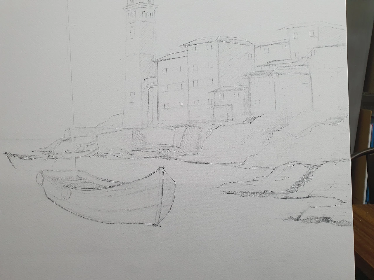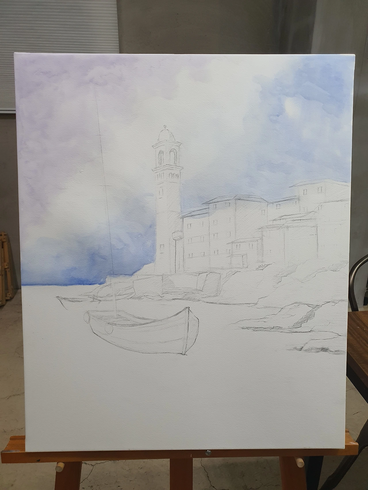 좀 전에도 얘기했지만, 이 그림의 주인공은 배와 종탑이다. 배는 형태를 정확하게 잡아줘야 균형감 있게 보인다. 휘어진 곡선과 선체의 두께를 표현해야 입체감이 살아난다. 그리고 전체적으로 스케치한 선들이 너무 지지분하게 겹쳐 있다. 이렇게 되면 나중에 채색할 때 색이 깨끗하게 나오지 않는다. 건물들도 너무 크기가 일정해서 원금감을 깨뜨린다. 가까이 올 수록 건물들의 크기는 조금씩 커져야 한다. (그래서 창문은 그리지 말라고 했던 건데, 나는 또 건성으로 듣고 그려버렸다) 해변과 바위도 너무 대충 그렸다. 채색을 위해서라도 스케치는 꼭 필요한 선으로 사물의 형태를 정확하게 그려 넣어야 한다. 빛이 들어오는 방향을 고려해서 그림자도 정확해야 한다. (그동안 스케치를 하지 않고 대충 그렸던 방식을 이제는 버려야겠다고 생각했다)