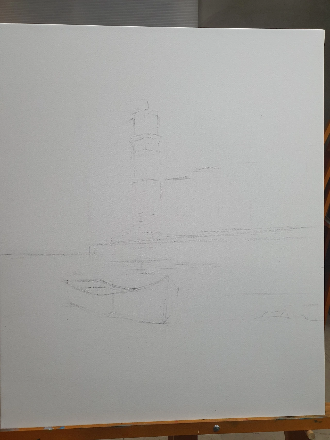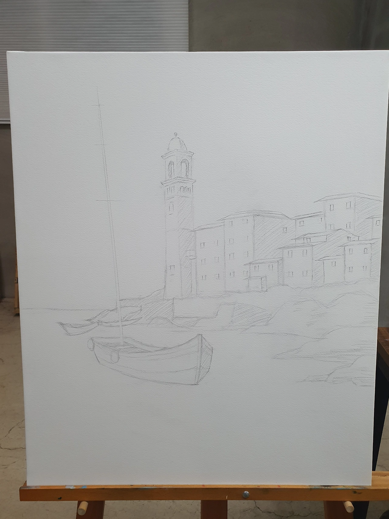 처음엔 수평선과 배, 종탑의 위치를 잡는다. 그다음은 대략적인 건물의 높이를 설정하고, 해변과 바위들이 바다와 만나는 지점을 정한다. 이 그림에선 배와 종탑이 주인공이므로 비율을 고려해서 대략적인 형태와 크기를 그려준다.