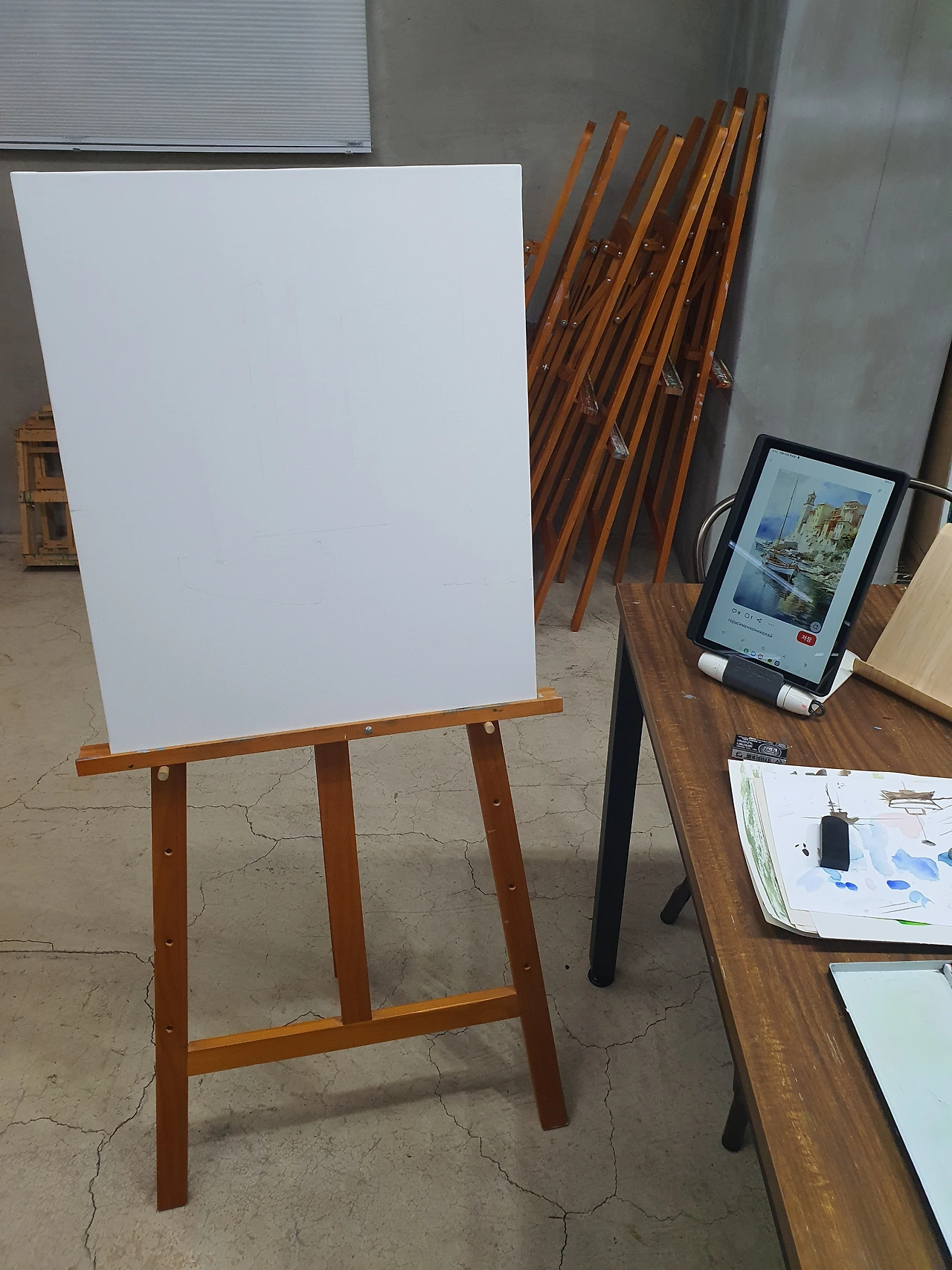 이번 달도 무사히 4회를 찍었다. 이로써 '성인취미미술' 나불갤러리 방문은 총 8회가 되었다. 그동안 (나무 그리기 연습한 거 빼고) 파브리아노 토천(Torchon) 스케치북 4절지에 풍경 수채화 1장, 8절지에 4장을 그렸다. 이제 아르쉬(Arches) 캔버스에 그리기 시작했는데, 기대감보단 걱정이 앞선다, 내가 잘 해낼 수 있을까 하는. 그동안 목요일마다 퇴근 후 미술학원에 가는 게 나름 즐거웠다. 학원에서도 2시간 동안 그리기에 집중했다. 근데 오늘은 대충 그리다 오자는 마음이 더 컸다. 벌써 싫증이 난 건가? (아니면 점점 자신감이 없어지니까 슬슬 포기하고 싶어진 건가?)