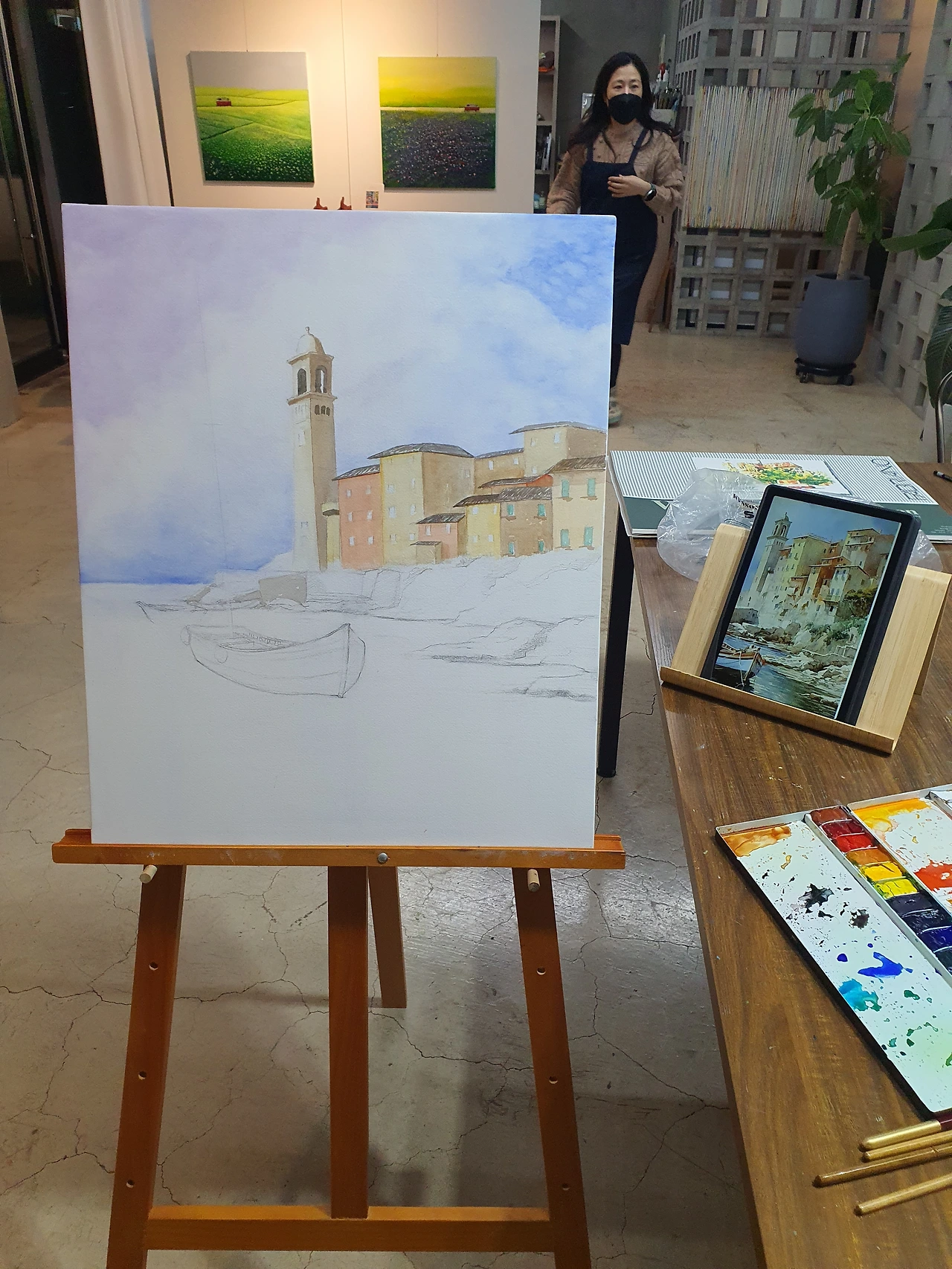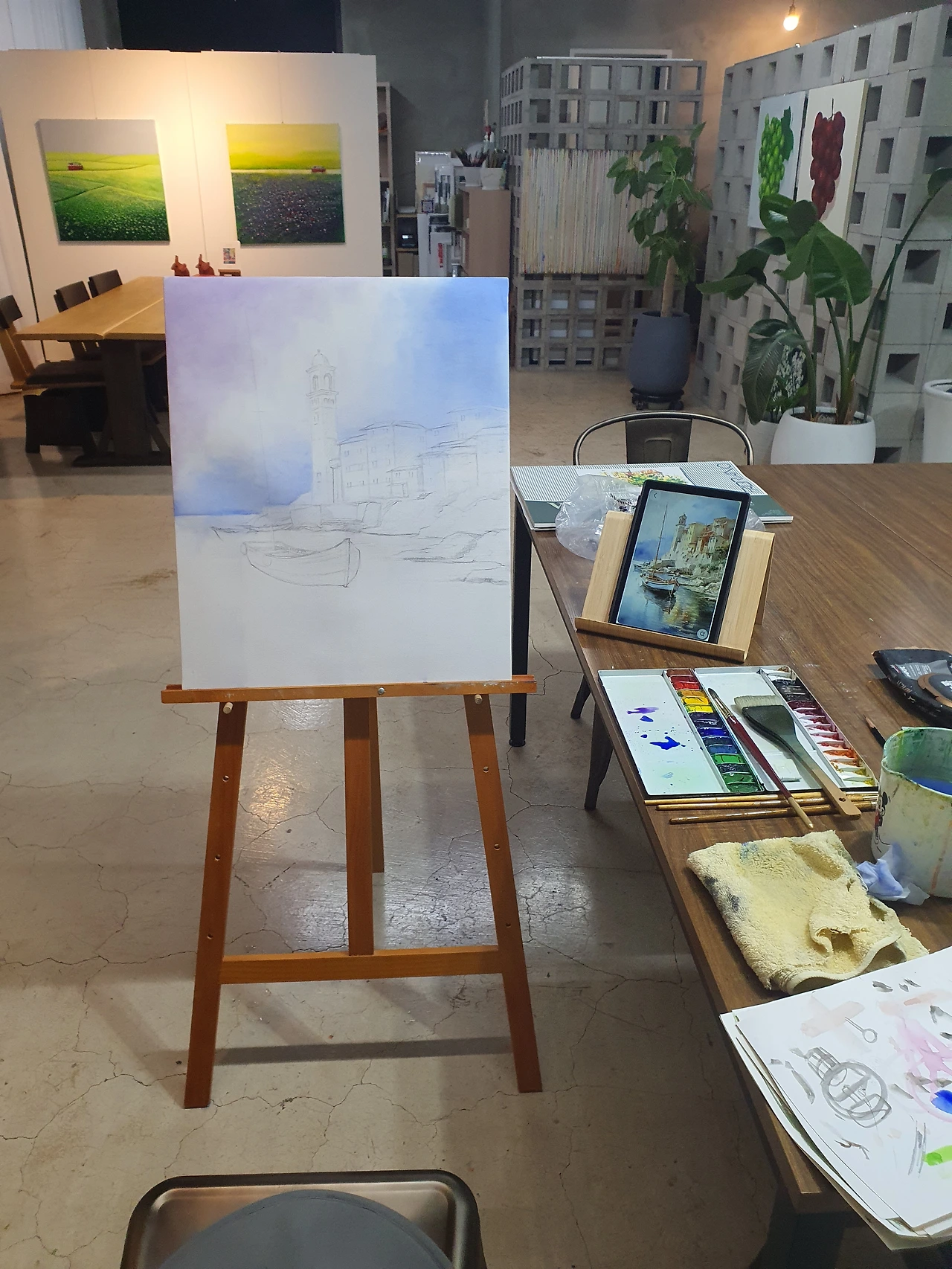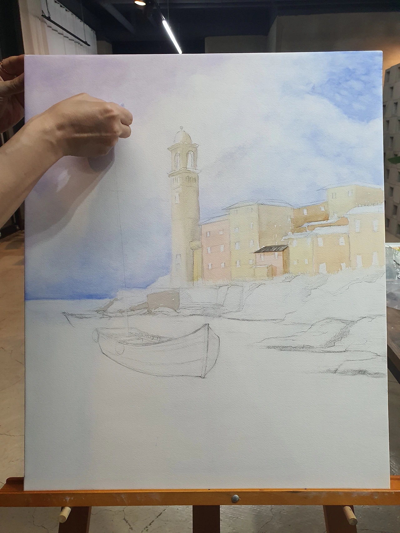 하늘이 완성되고 나니 그다음은 의외로 빠르게 진행되었다. 다만, 내 조급함(마른 상태의 물감을 여러 번 붓질을 통해 충분히 녹여 팔레트 한쪽에 미리 준비해두지 않고, 그때그때 붓에 물을 듬뿍 찍어 수시로 녹여 쓰다 보니, 마음은 조급해지고, 색은 마음대로 안 나오고, 붓에 머금은 물기 제거도 바로바로 하지 않아 종이 위에 물 자국은 그대로 남아있고, 선은 대충 그려 삐뚤빼뚤하고, 사물과 사물의 경계는 '애매모호'해지고...)을 오늘도 지적받았다. (상대적으로) 작은 팔레트 크기에 대해 지적받았고, 12색이 부족한 학생용 수채화 물감 20색 세트에 대해 지적받았고, 처음 왔을 때보다 그림에 힘이 너무 많이 빠져있다고 지적받았다. (건물을 채색할 땐 입체감을 고려해서 그림자를 넣어야 한다. 특히 종탑의 경우 이 그림의 주인공인 배와 함께 중요한 부분이니 더욱 신경을 써야 한다. 사물에 비치는 빛은 주변에 반사되어 들어오는 반사광도 있으니 그 부분을 고려해서 건물 표면의 밝기를 조절해야 한다 등등)