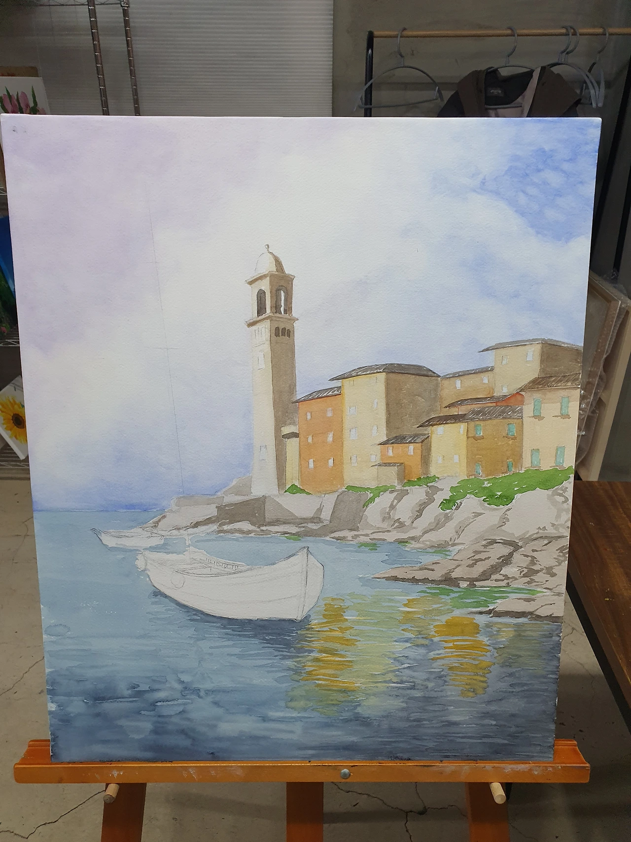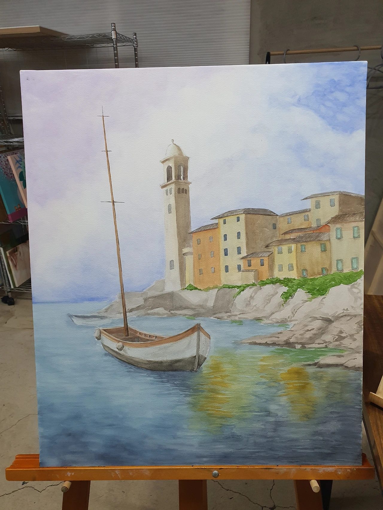 선생님의 의견에 바위 칠하기를 멈추고 바다를 칠하기 시작했다. 전에도 한 번 언급했지만, 수채화에서 표현하기 어려운 것들이 몇 가지 있다. 구름, 나무, 바위, 물(호수, 강, 바다), 유리, 얼굴 등등. 역시나 바다도 구름만큼이나 어려웠다. 하지만, 오늘의 목표는 어떻게든 그림을 두 시간 안에 완성하는 거니까, '아님 말고' 정신으로 계속 칠해나갔다. 수면에 비친 건물도 넣고, 배의 밑부분 그림자도 넣고, 바다가 어느 정도 칠해졌다 싶어 바위를 마저 칠하고, 건물과 바위 사이에 있는 수풀을 칠했다.