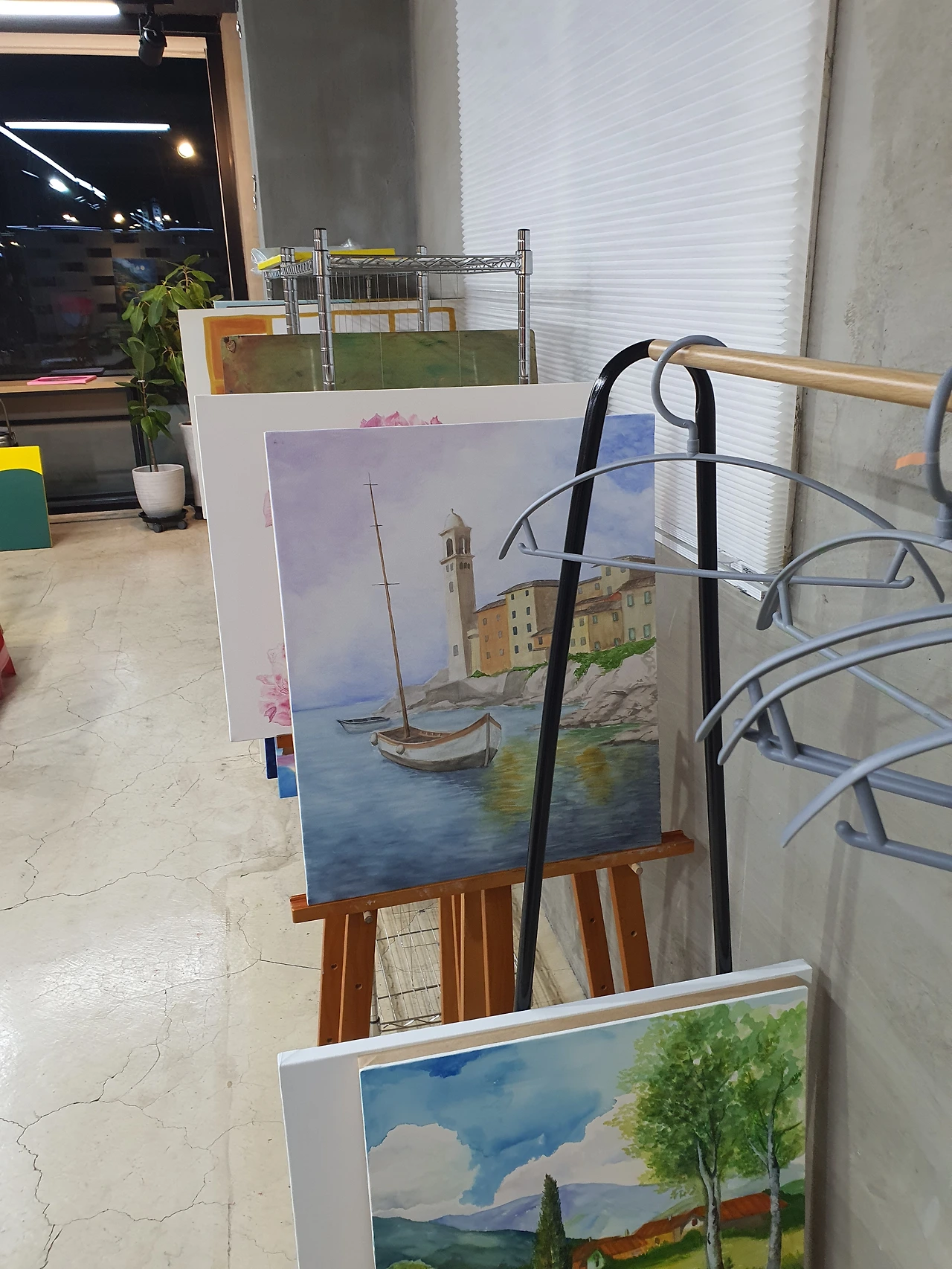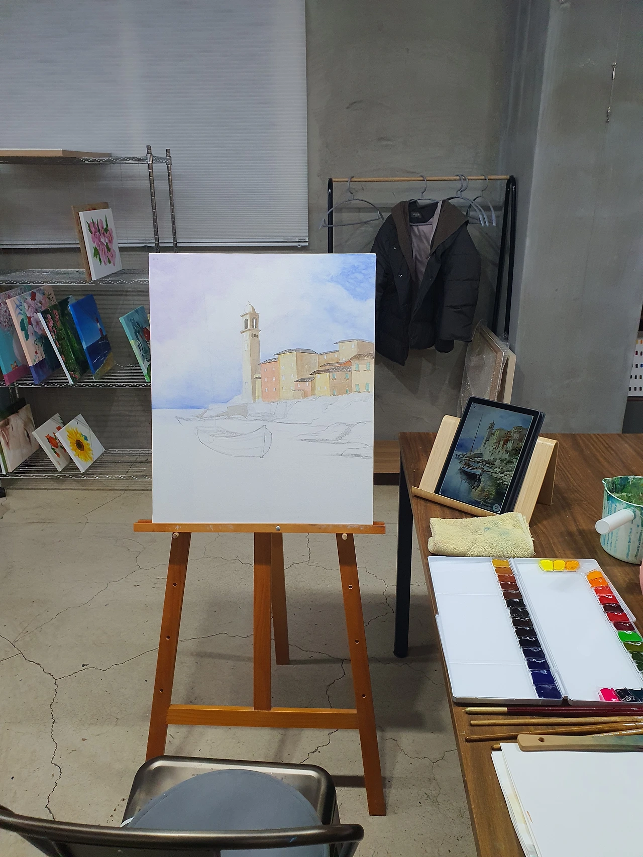 오늘의 목표는 어떻게든 그림을 두 시간 안에 완성하는 거라, 도착하자마자 신속하게 그림 그릴 준비를 완료했다. 지난번에 그리다 만 아르쉬지 패널을 찾아 이젤에 세팅하고, 물통에 물을 담고, 붓과 팔레트, 물기를 제거할 수건과 종이 위에 실제로 내가 원하는 색이 나오는지 테스트하기 위한 이면지, 물티슈 등등. 선생님은 다른 수강생들을 지도하고 있어서, 곧바로 바위부터 칠하기 시작했다. 가까운 바위는 진하게, 먼 바위는 연하게 칠했다. 어느 정도 칠하고 나니 선생님이 다가왔다.