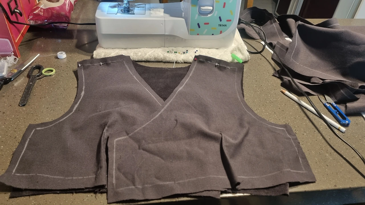 도안을 사이즈에 맞춰 먼저 자른다. 확실히 상체에 패턴이며 라인이 복잡하다. 다 자르고 나면 이제 원단을 뒤집어 펼쳐서 잘린 패턴을 위에 올려 초크로 그린다. 이때 주의 할 것은 원단의 방향이다. 코듀로이는 세로줄이 있는데 거의 위에서 아래 방향으로 향하도록 옷을 만들고 허리에 들어가는 띠만 가로줄로 만든다. 그래야 이쁘고 세탁 후에도 잘 틀어지지 않는 것 같다.