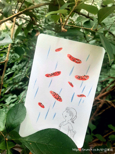 “신기하지? 그래서 아빠도 비 오는 날이 신기해. 하늘에서 빨간 빈대떡이 떨어지잖아.”