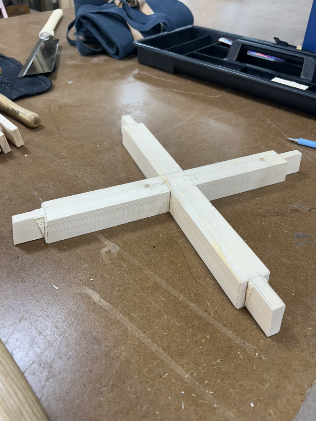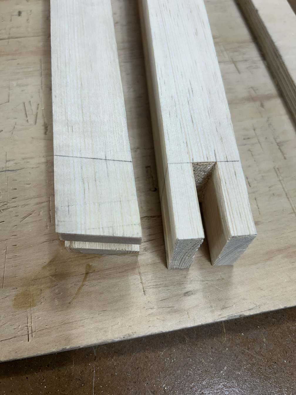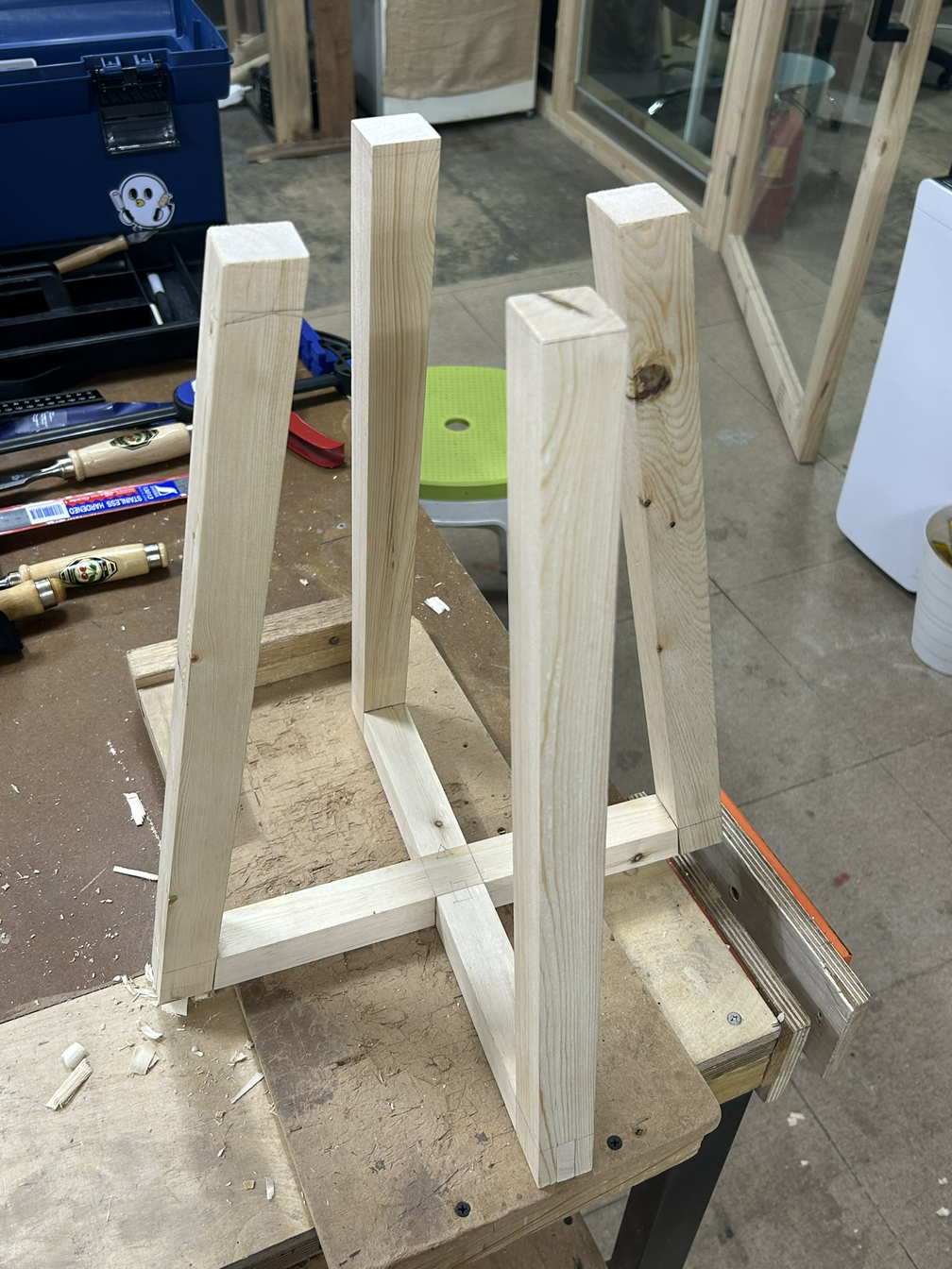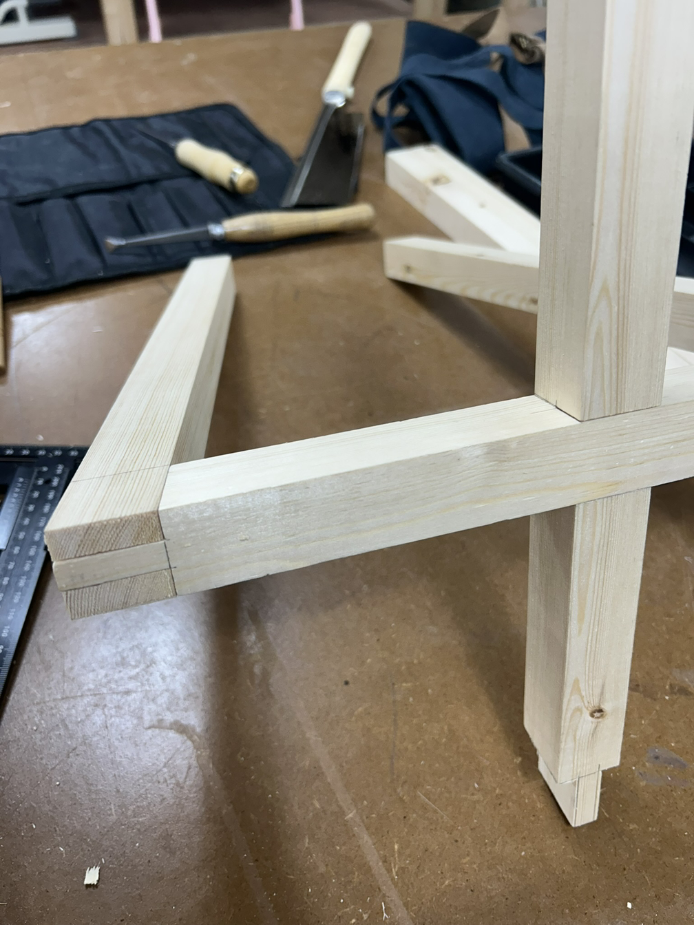 먼저 하단부는 +자 모양은 반턱맞춤으로, 양 끝은 다리와 결합을 위해 브라이들 조인트 촉으로 가공해야 한다. 먼저 테이블쏘로 반턱을 날리고 끌로 마무리를 했다.