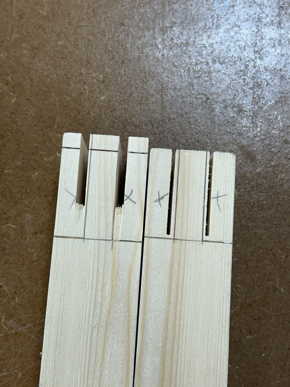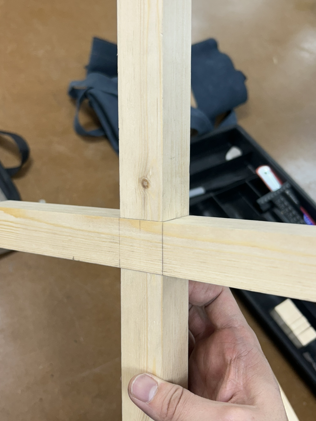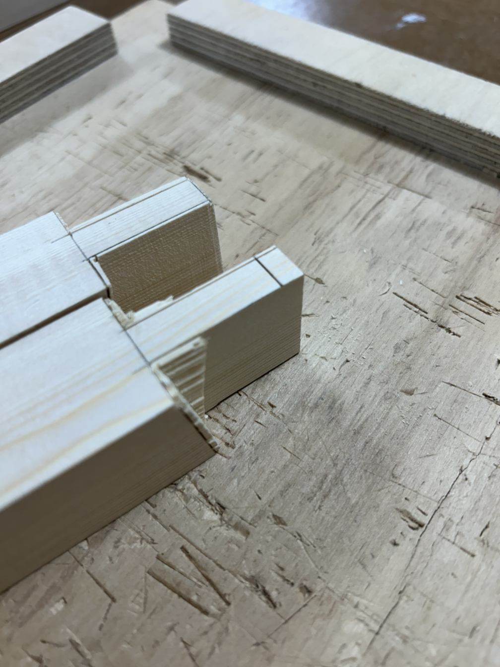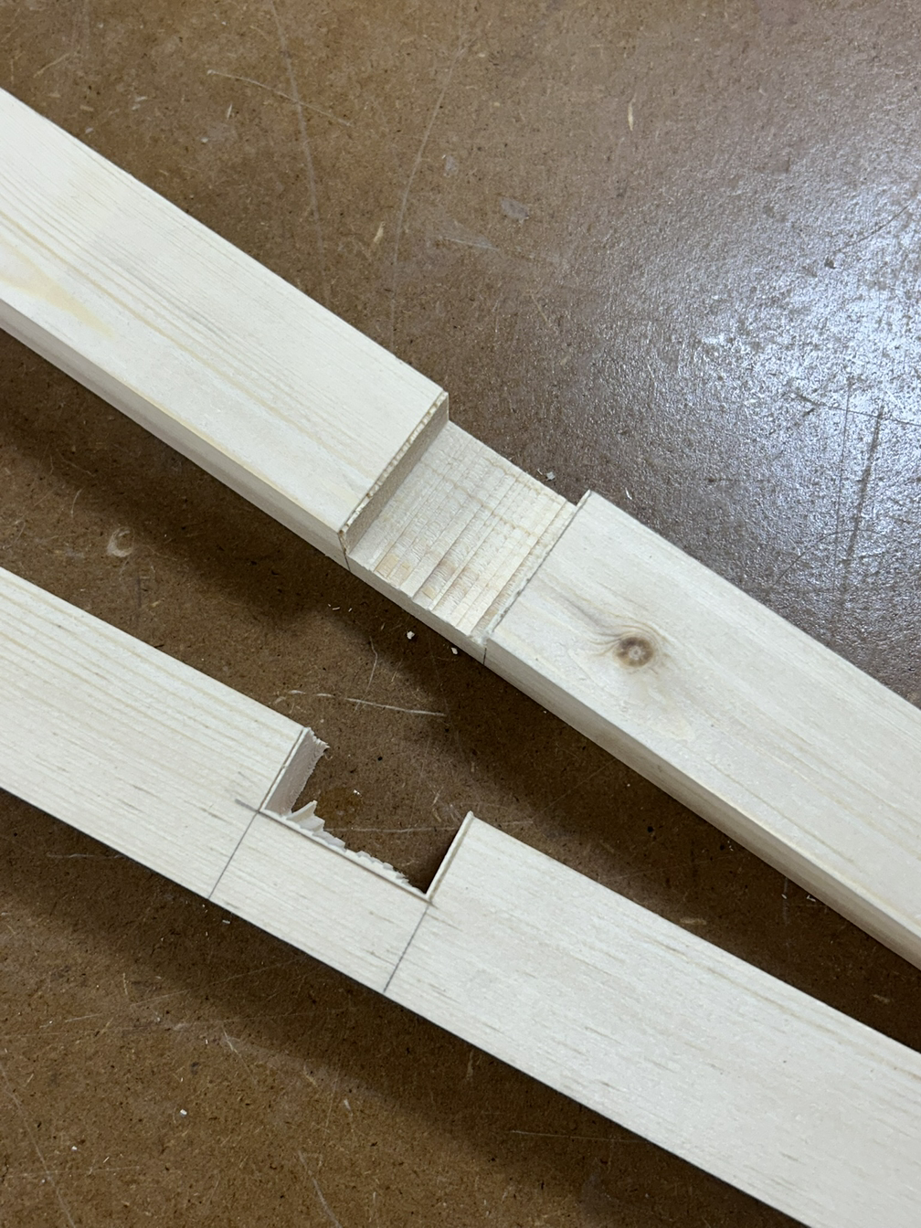 먼저 하단부는 +자 모양은 반턱맞춤으로, 양 끝은 다리와 결합을 위해 브라이들 조인트 촉으로 가공해야 한다. 먼저 테이블쏘로 반턱을 날리고 끌로 마무리를 했다.