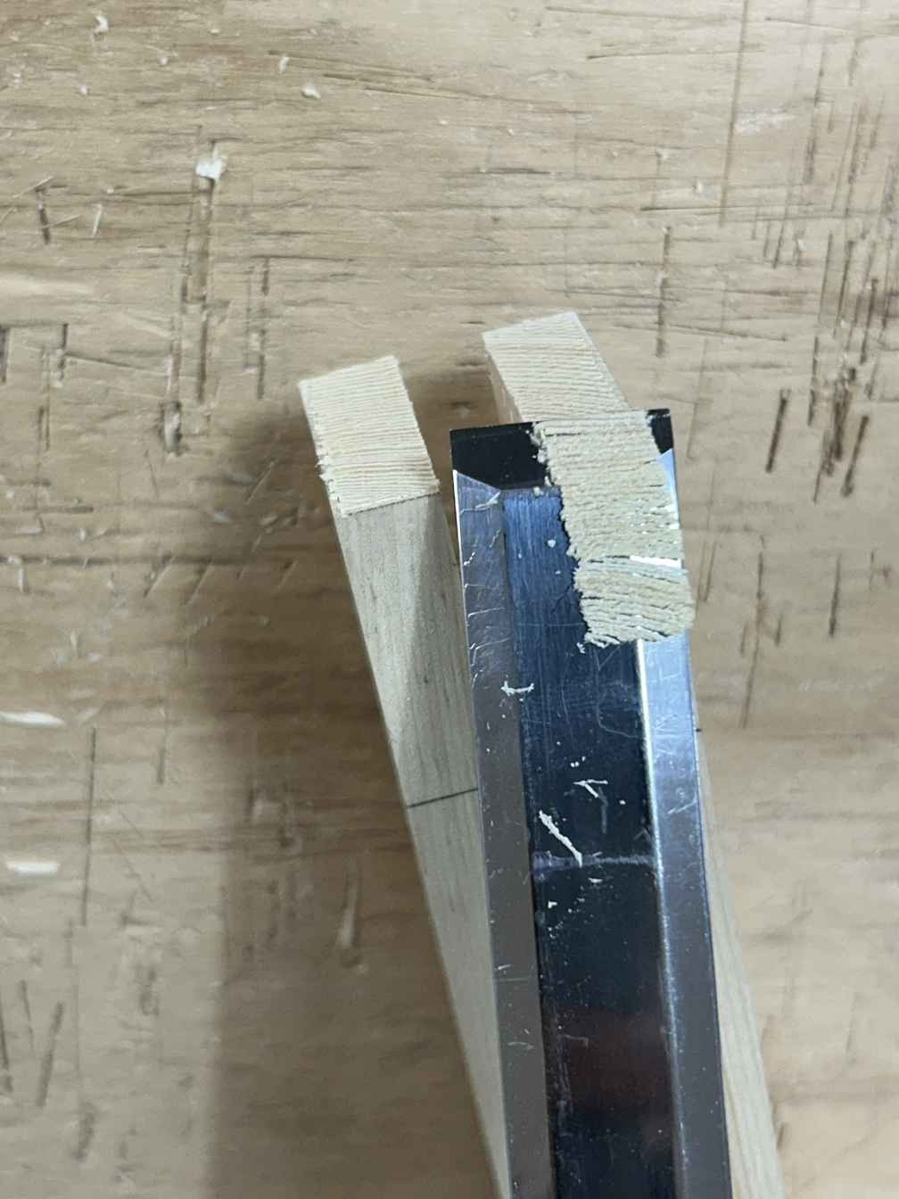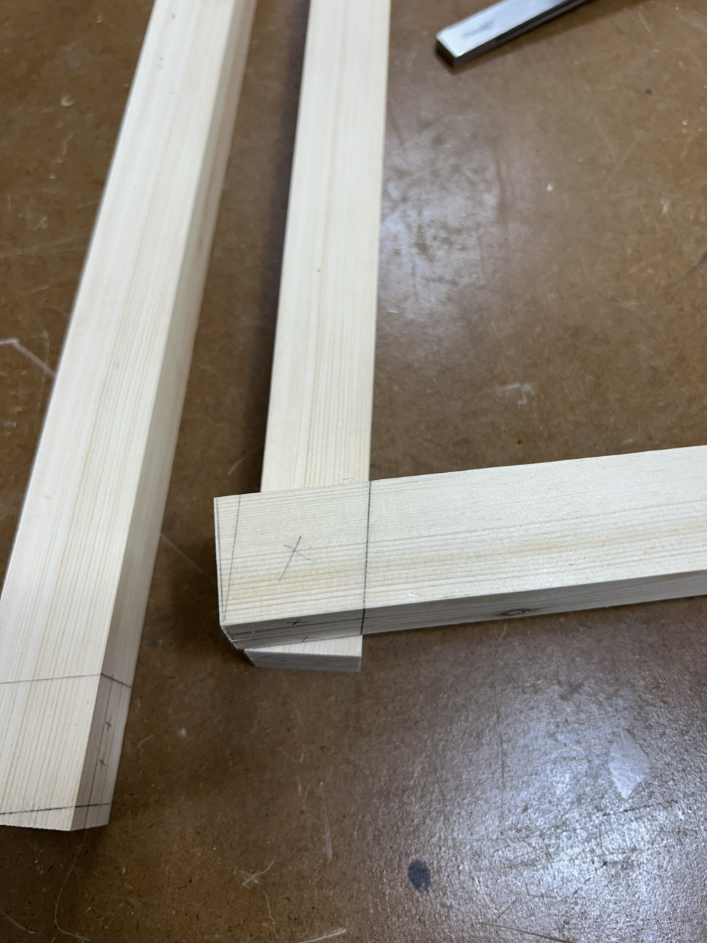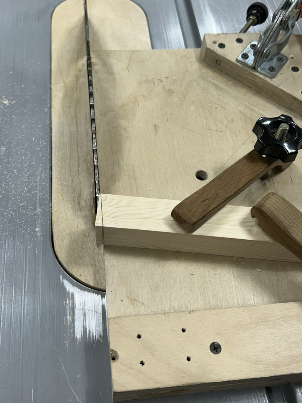 먼저 양쪽 끝 빗면을 테이블쏘+지그를 이용해 날리고, 3등분 중 가운데 부분을 밴드쏘로 따내고 끌로 마무리했다.