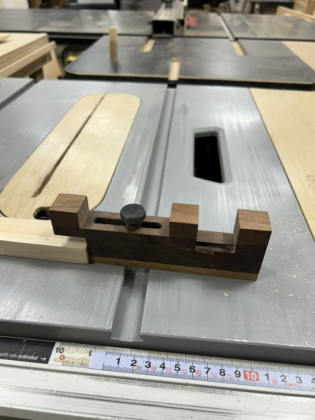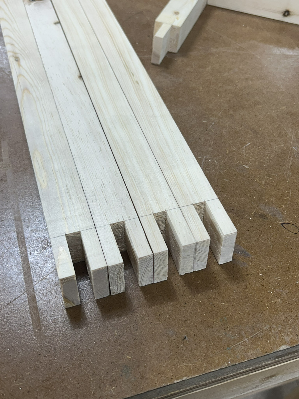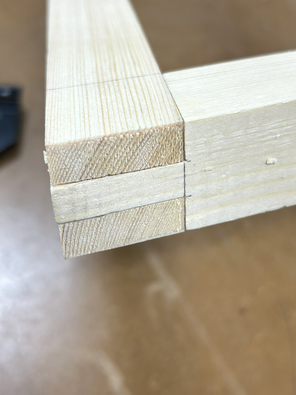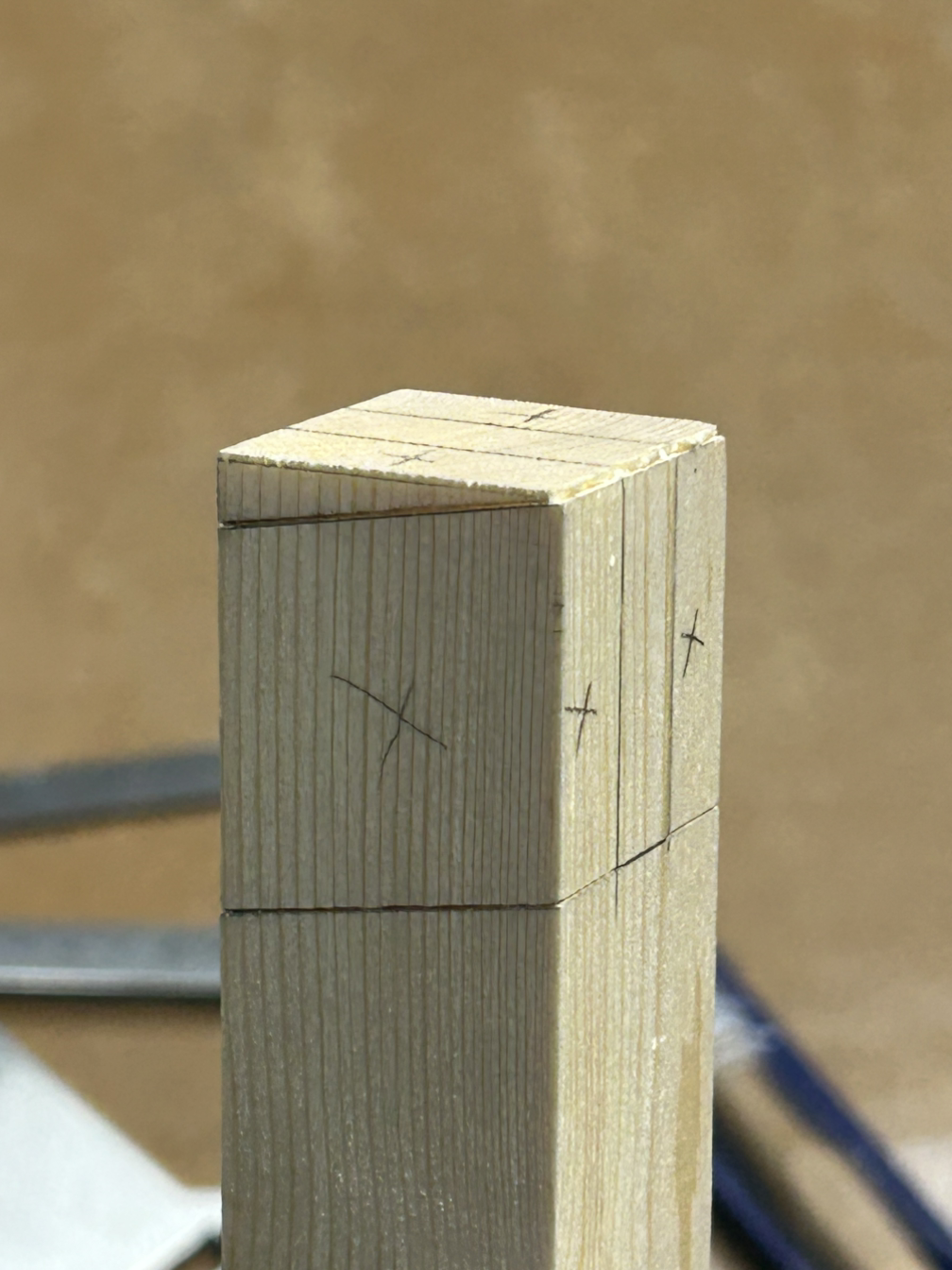 먼저 양쪽 끝 빗면을 테이블쏘+지그를 이용해 날리고, 3등분 중 가운데 부분을 밴드쏘로 따내고 끌로 마무리했다.