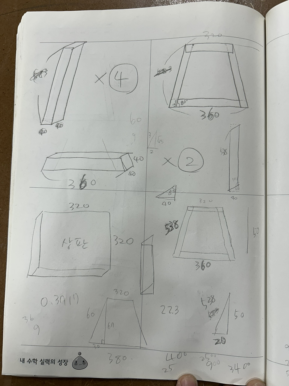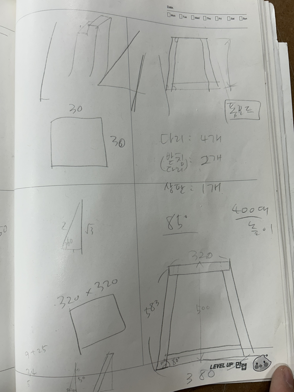 상판의 크기와 하단 받침 크기, 상판까지의 수직 높이를 적당하게 정했으니 그걸로 빗면의 길이를 피타고라스 정리로 구할 수 있었다.