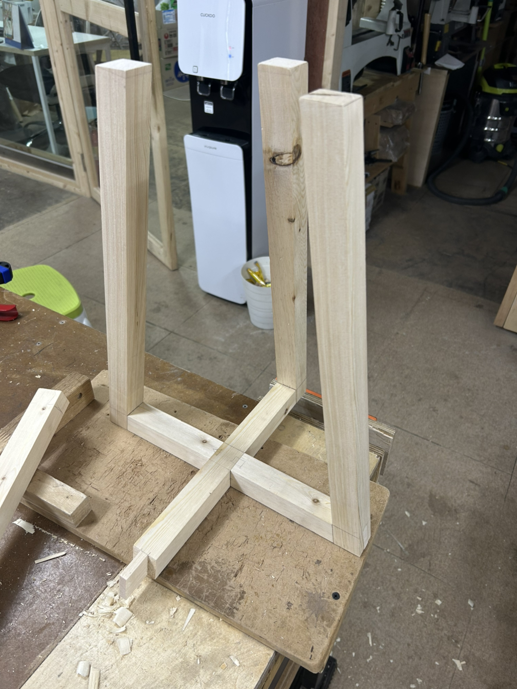 도면을 대충 그리다 보니 상판 크기를 정할 수 없어서 다리 윗부분을 먼저 만들어 꽂고, 이 네 다리가 만들어내는 윗부분(가상의 정사각형 공간) 크기대로 상판을 재단하려고 한 것이다.