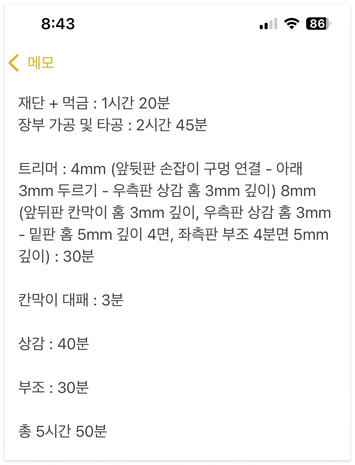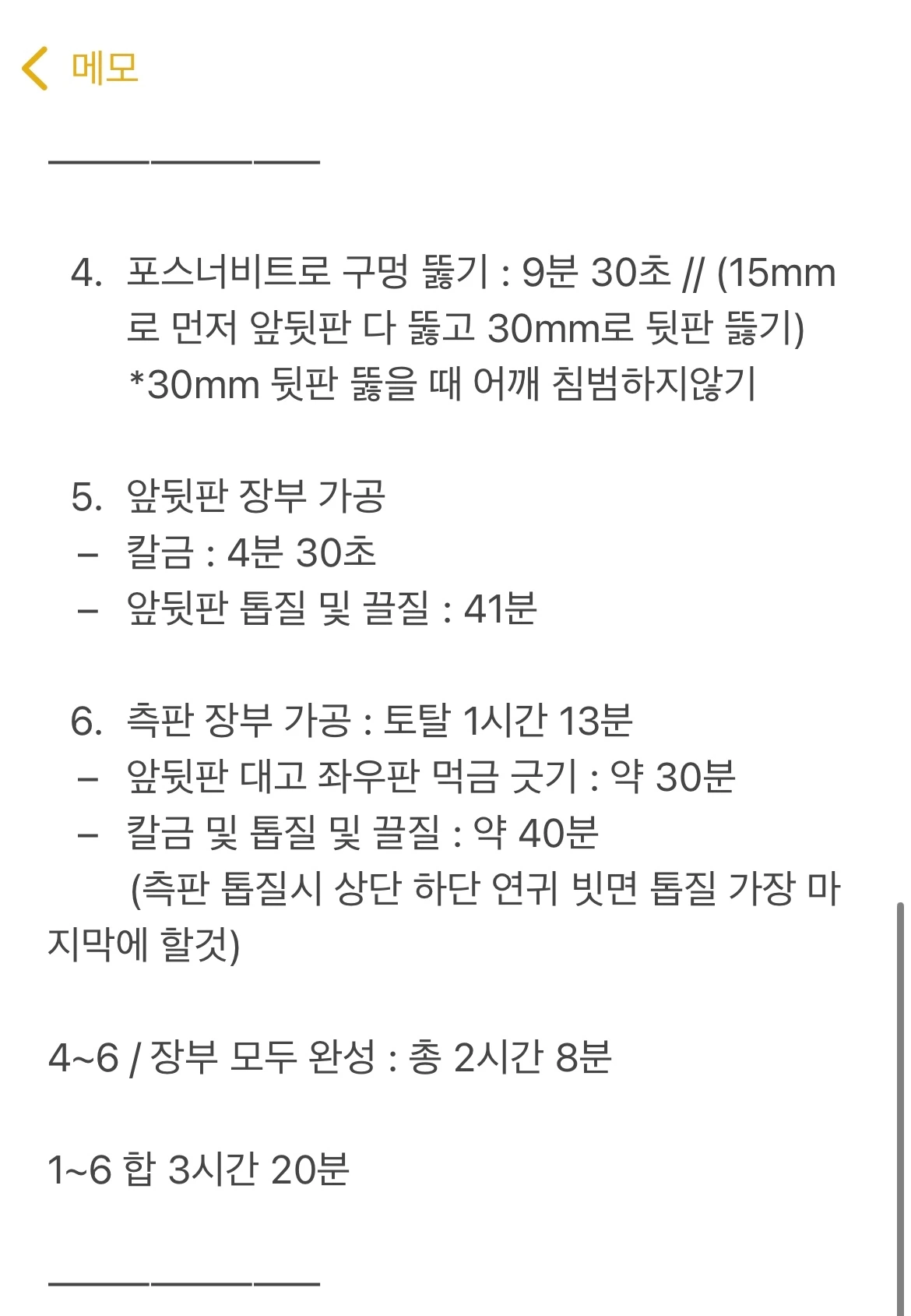 : 가장 시간이 많이 걸린 공정은 앞뒤/좌우측판 장부 가공 및 타공(2시간 45분)으로, 원인은 그냥 습관적으로 꼼꼼히 했기 때문이었다. 어차피 목공예기능사 실기 시험은 높은 점수를 받으려고 하는 것이라기보다 60점만 넘기면 되기 때문에, 장부의 완성도를 의식적으로 떨어뜨리고('헐렁해도 좋다'는 생각으로) 속도에 집중을 하면 되겠다는 생각을 했다.
