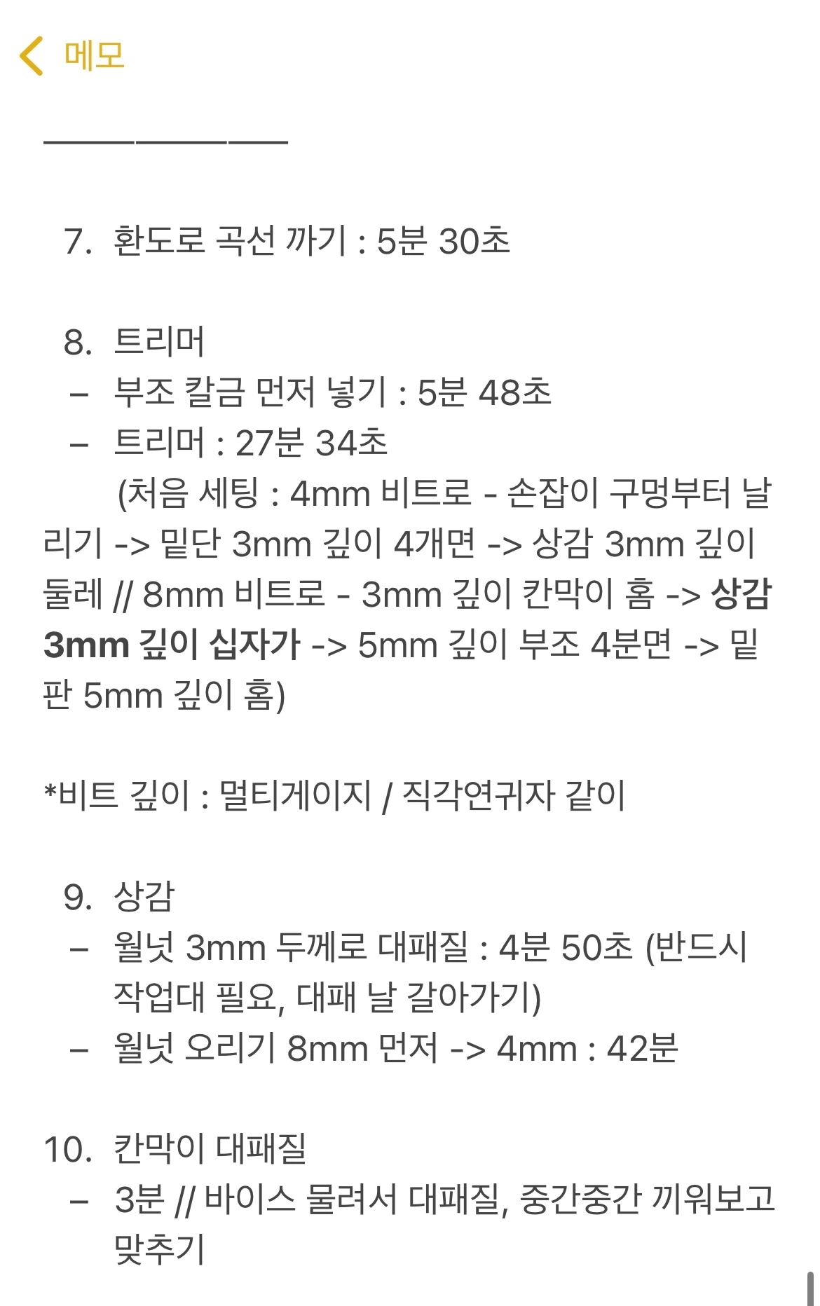 예를 들면, 재단도 처음 부재를 받았을 때 먹금을 어떻게 긋고 어떤 순서로 재단을 할지, 가장 효율적인 순서를 잡고 이를 외우다시피 하는 것이다. 마찬가지로 트리머를 써야 할 때, 트리머를 써야 하는 작업은 그러한 작업들끼리 최대한 공정을 붙여서 한 번에 해버리는 것이다. 그게 잡혀있지 않을 때는 아무 생각 없이 트리머를 썼다가, 다른 작업을 하다가 또다시 트리머를 다른 비트와 세팅으로 다시 쓰곤 했는데, 이렇게 뒤죽박죽이다 보니 불필요한 시간들이 소요된 것이다.