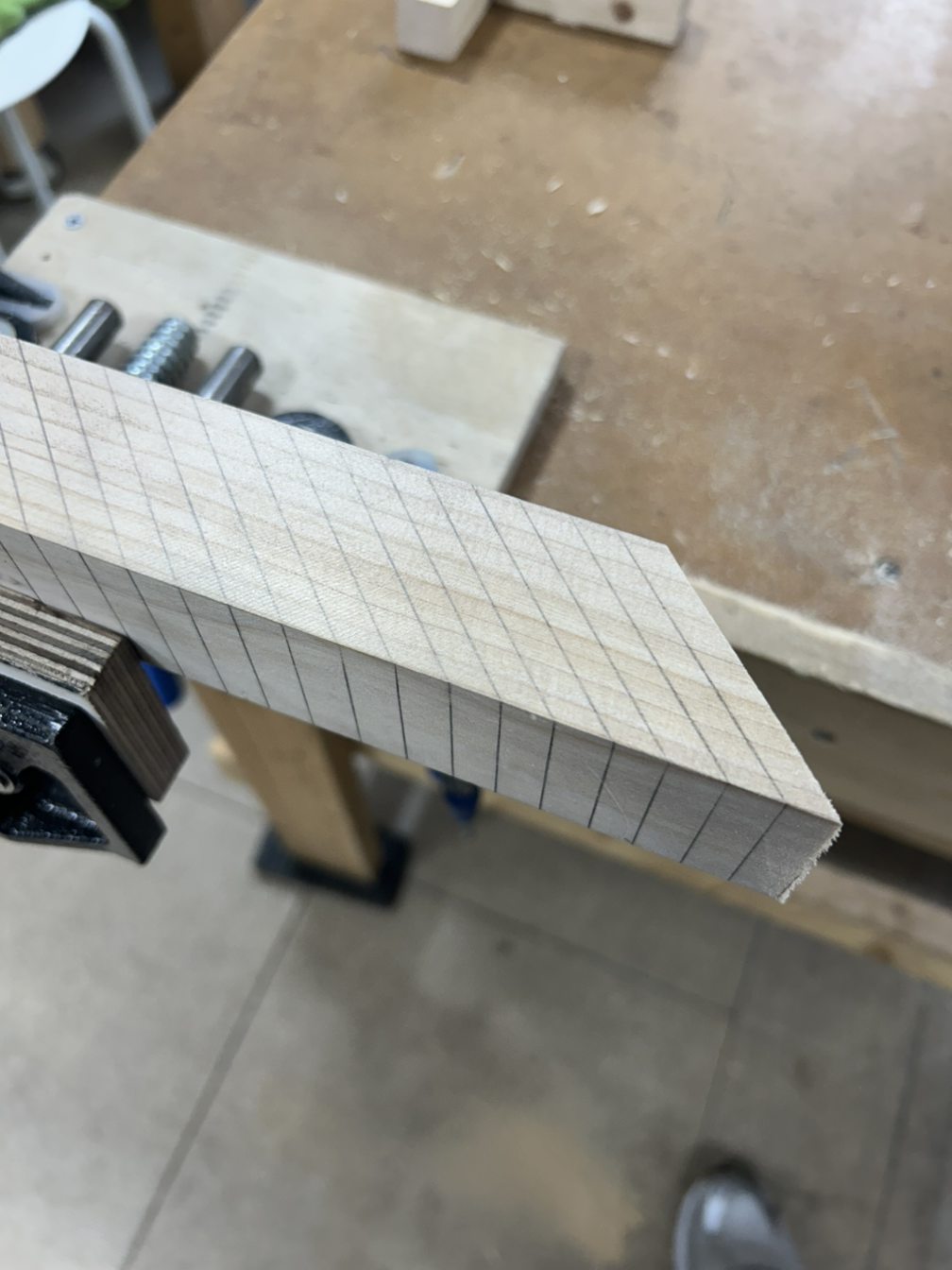 기본이되는 수직면 톱질 연습만큼이나 주먹장 같은 장부를 따거나, 연귀(45도의 빗면) 형태의 가공을 위해서 빗면 톱질 연습도 중요하다.
