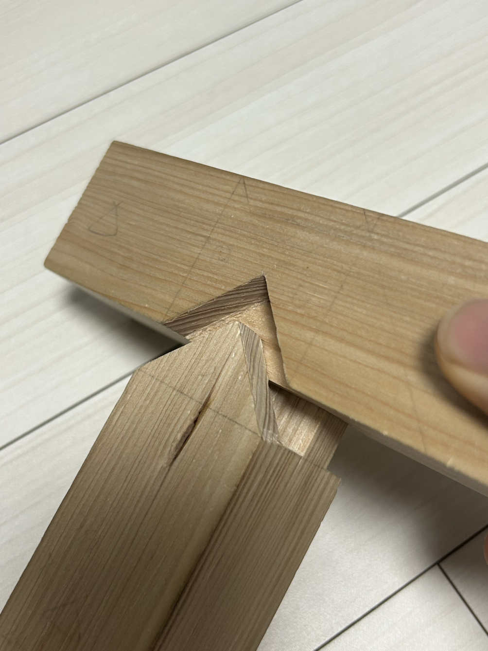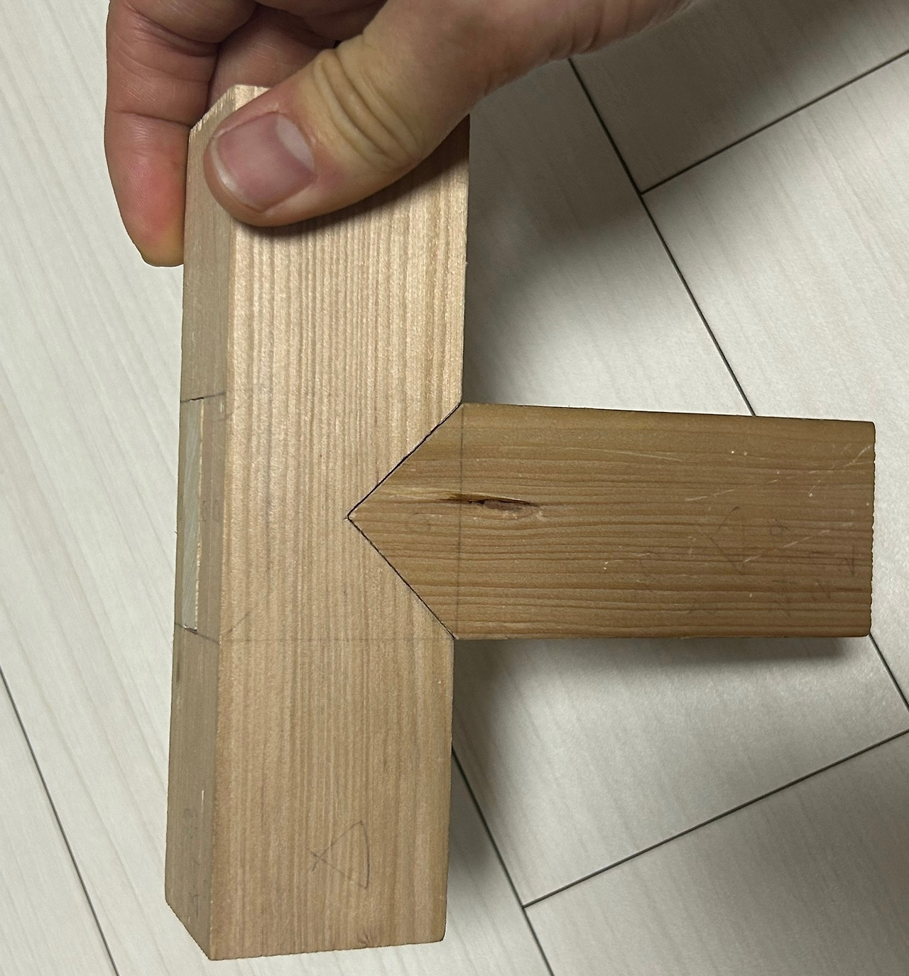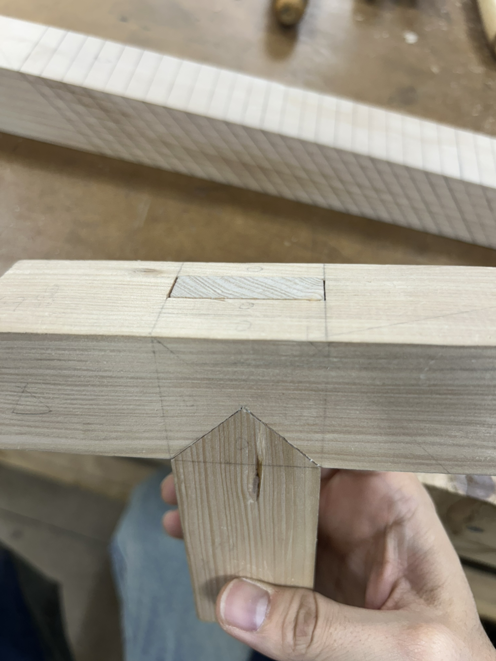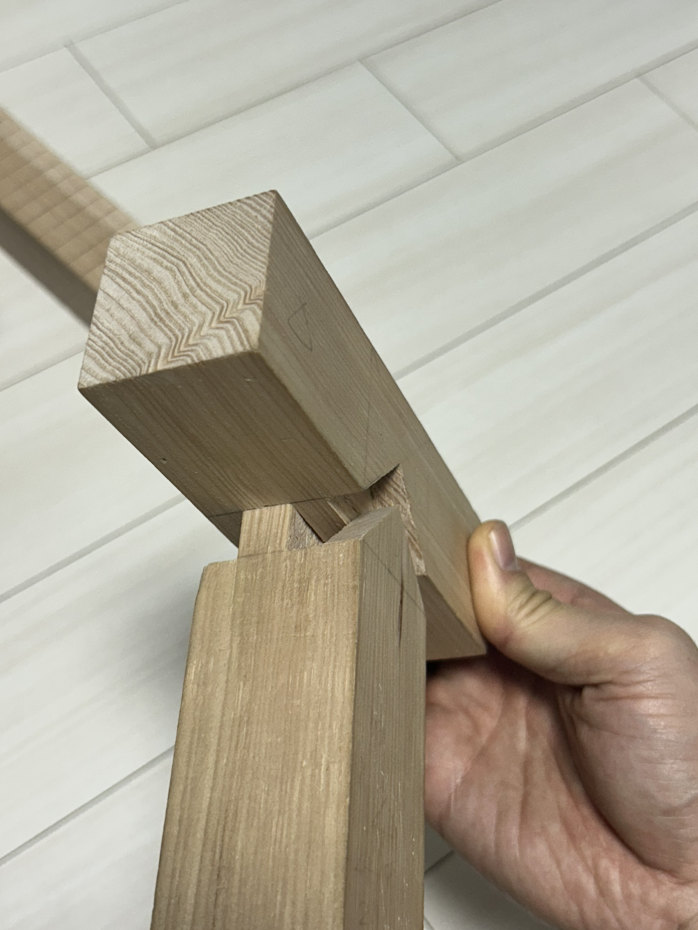 먼저 숫장부 가공을 한다. 장부 가공에서도 암나사 수나사처럼 튀어나온 촉 부분을 숫장부, 반대를 암장부라고 부른다.