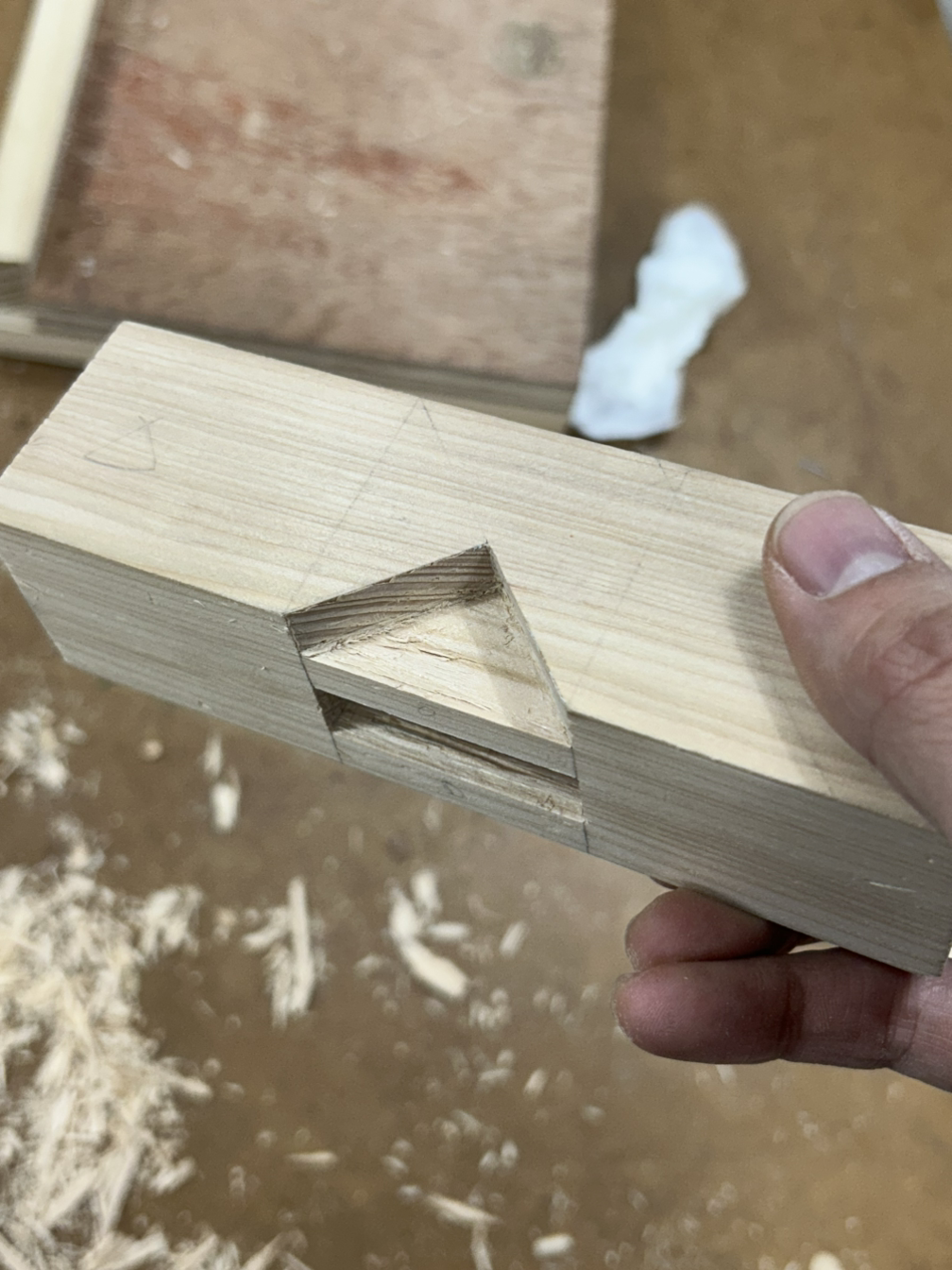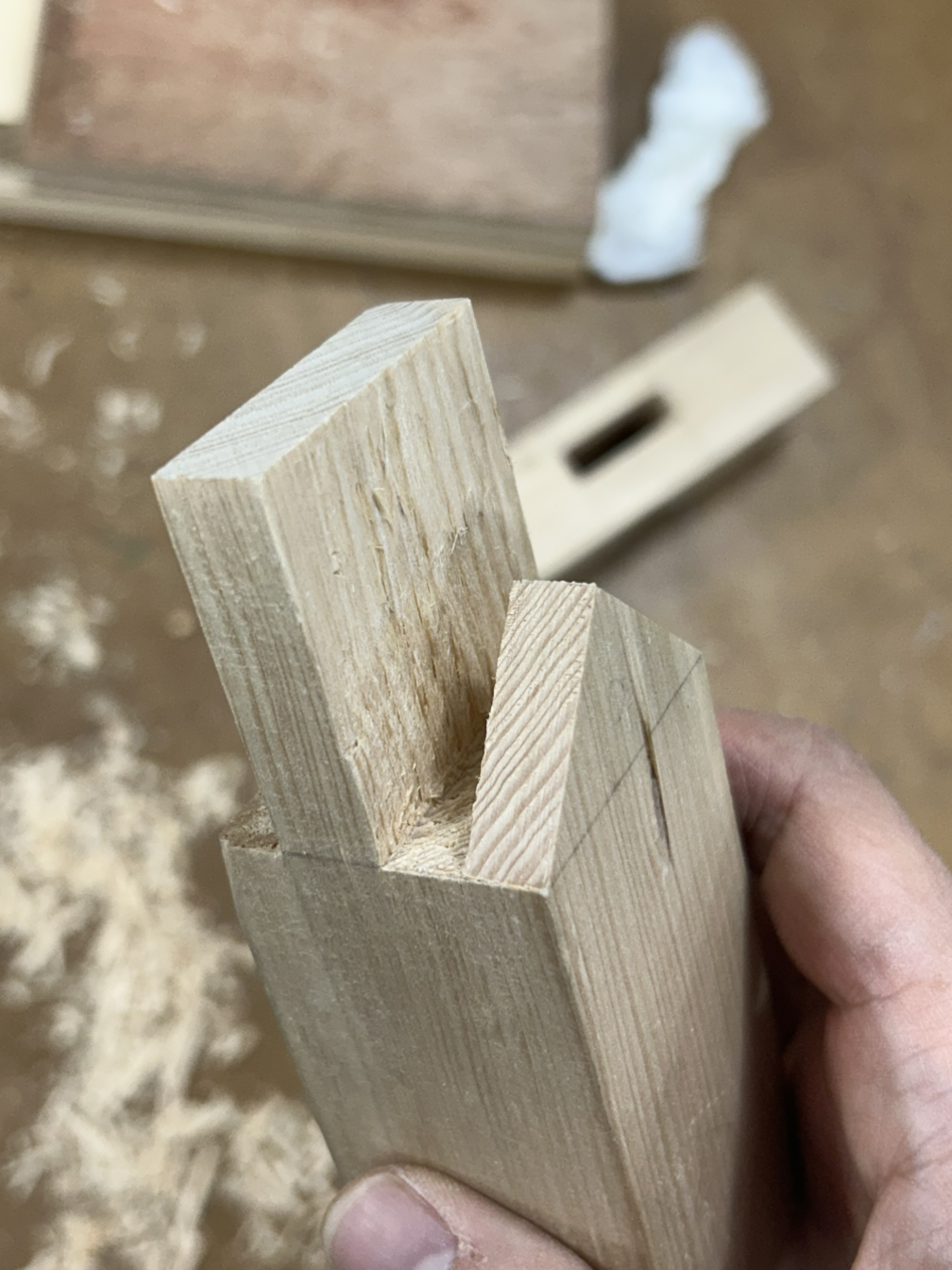 숫장부의 제비촉 부분을 조금 더 살려둔 상태로 암장부 홈에 맞춰보면서 조금씩 줄여나가야 하지 않을까 하는 생각이 들었다.