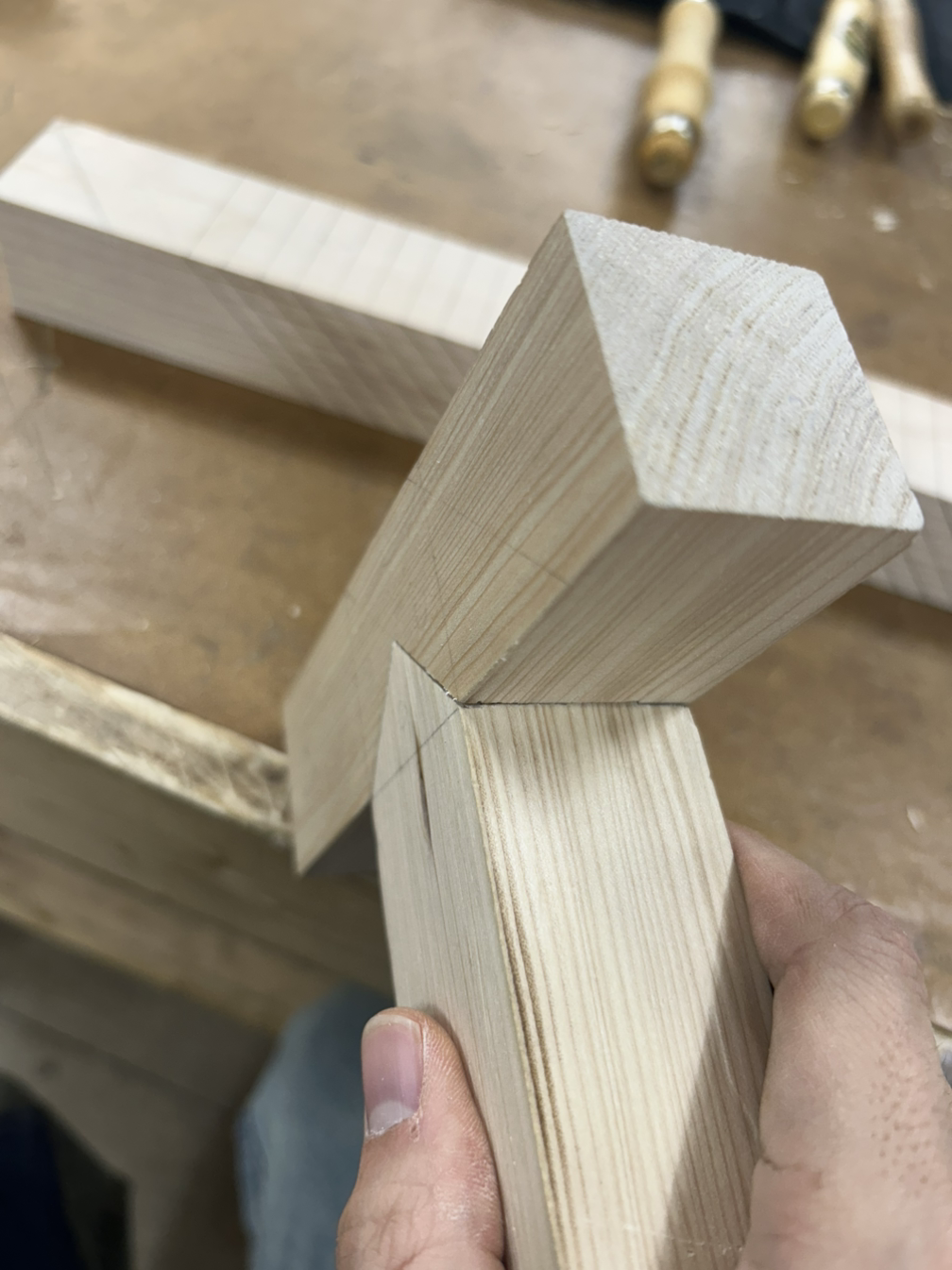 일전에 수공구로만 했을 때 가장 오래걸리고 팔이 아플 정도로 힘들었던 게 관통장부였는데, 이번에는 각끌기를 알려주셔서 기본 작업을 하고 마무리 정리를 끌로 했더니 한결 수월했다.