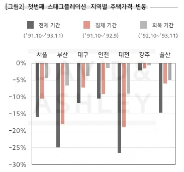 90년 국내에서 발생한 1차 스태그플레이션과 달리 이번엔 경기가 회복되는 시점을 기준으로 집값이 반전하며 일부 대구, 대전, 서울 지역의 집값이 소폭 상승했습니다. 다른 지역도 하락폭을 줄이며 부동산 시장의 분위기가 서서히 바뀌었음을 확인할 수 있습니다.