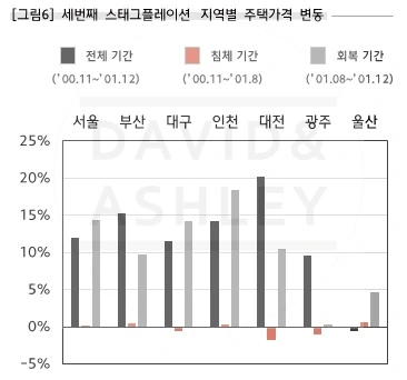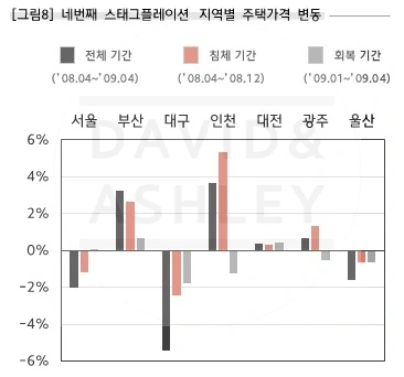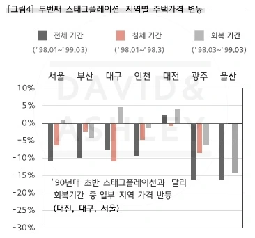 해당시기의 지역별 집값은 과거 1, 2, 3차 스태그플레이션과 달리 침체기와 회복기의 뚜렷한 차이가 보이지 않았습니다.