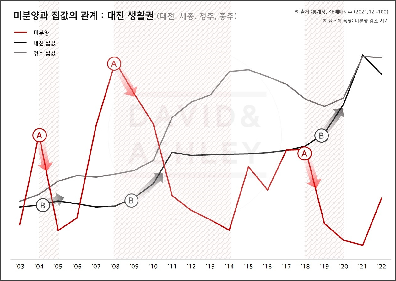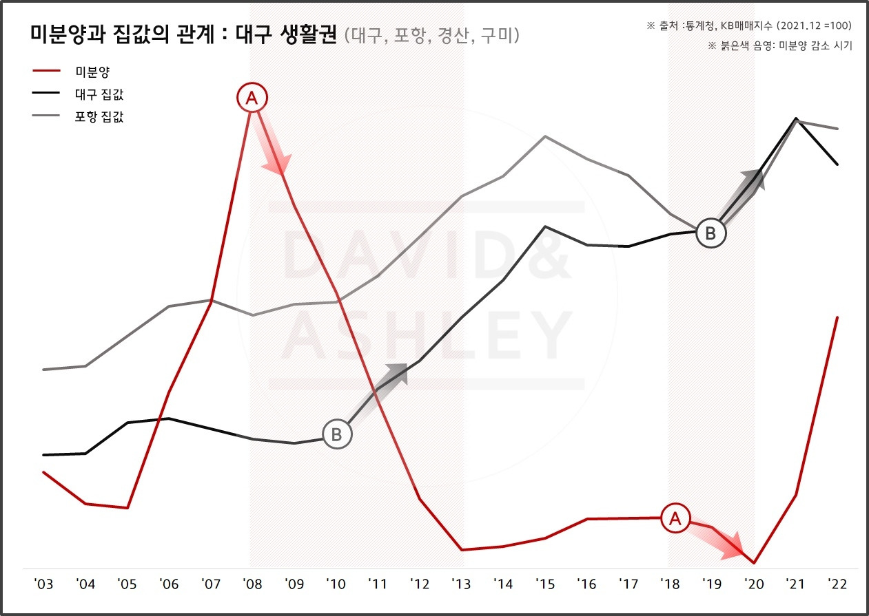 [대구+경북, 대전+세종+청주] 미분양(붉은실선A) 감소 이후 상승했던 집값(검은실선B)