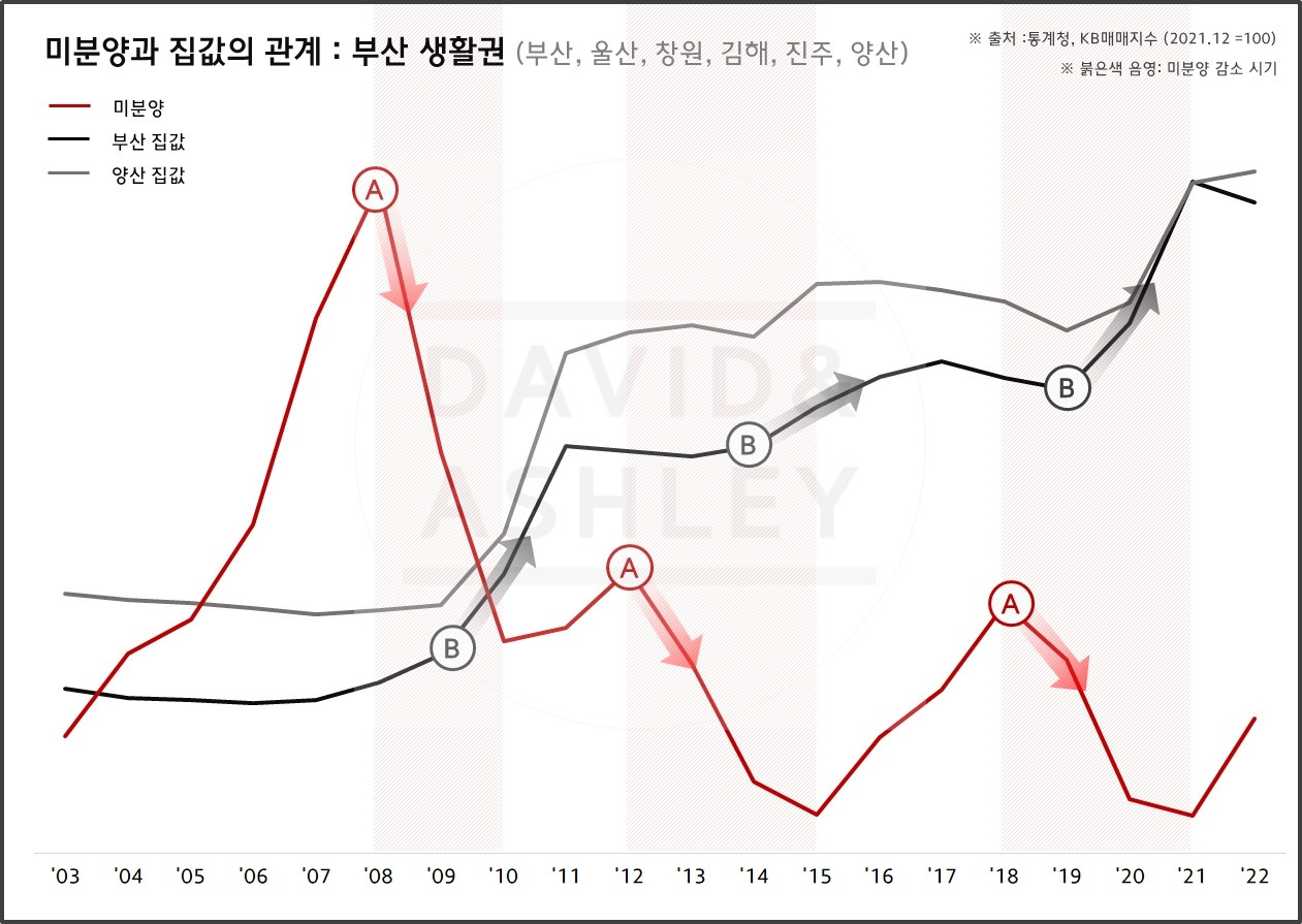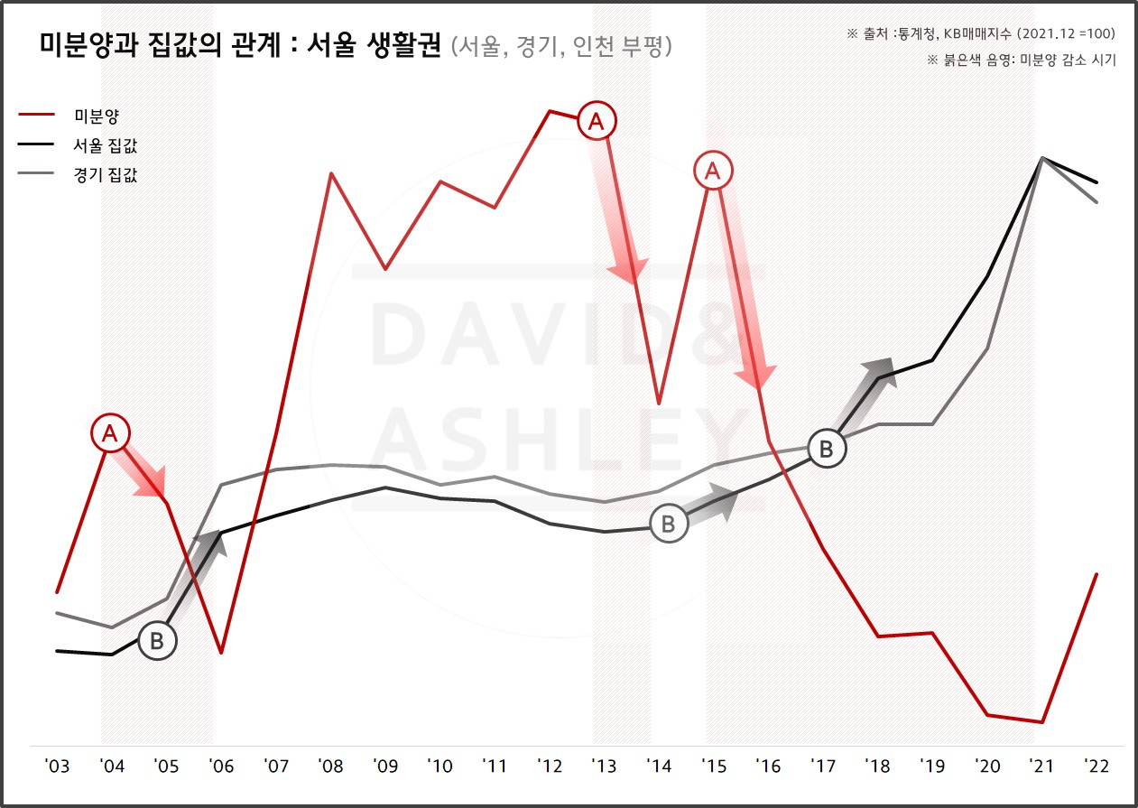 [서울+경기, 부산+경남] 미분양(붉은실선A) 감소 이후 상승했던 집값(검은실선B)