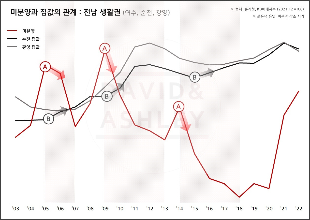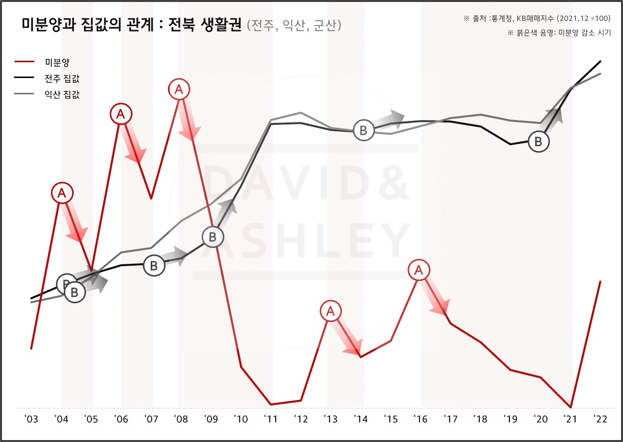[전북, 전남] 미분양(붉은실선A) 감소 이후 상승했던 집값(검은실선B)
