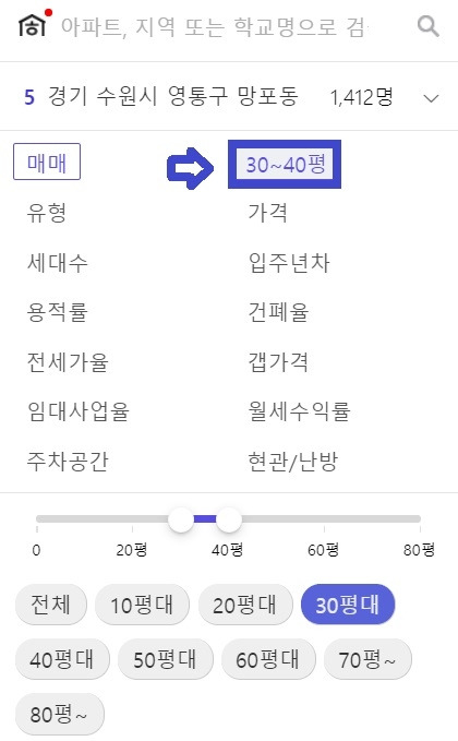 [방법 1-1] "호갱 노노 사이트 혹은 앱 접속 → 필터 → 평형 → 30평대 클릭"